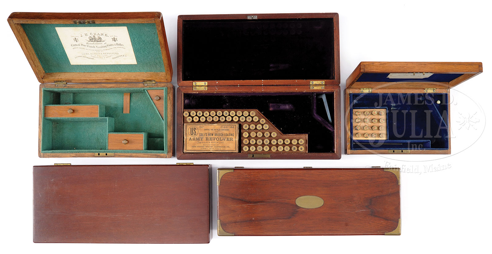LOT OF 5 WOODEN PISTOL CASES.1) English style oak case for a Colt Lightning revolver Model 1877 with a 3-1/2″ bbl. Case has brass disc inlaid on lid. Lid is attached with screws. Case is lined with blue velvet. Lid has Colt Firearms Company London label. Case contains a cartridge block for 16 rounds and a combination screwdriver tool. Corner compartment has an bone pull. 2) An English oak case for a Colt Model 1878 DA revolver with a 5-1/2″ bbl. Case has brass disc inlaid on lid. Inside lid has label of “J.H. CRANE LONDON”. Case is lined with green velvet and has 3 compartments with oak lids and provision for a box of cartridges. 3) An American mahogany case for a Colt 1860 army conversion revolver. Case has a pine bottom. Case is lined with purple velvet and has a wooden block with 50 orig cartridges. Case also contains and empty box for these cartridges. Box is labeled “CALIBER 44 /FOR / COLT’S NEW BREECH LOADING ARMY REVOLVER / MADE BY UNITED STATES CARTRIDGE COMPANY”. Box also contains a Colt L-shaped combination screwdriver. 4) Brass bound mahogany box for an unknown revolver. Box has brass plaque inlaid on lid. Corners are brass bound. Inside of box has been re-lined and has no partitions. Orig lining appears to have been purple. 5) Mahogany case for a Colt 7-1/2″ SA revolver. Case is contemporary reproduction. Lining is blue of the French fit design. Case contains brass cleaning rod and brass key. PROVENANCE: The spectacular collections of Ray Bentley featuring the finest and rarest deluxe antique Winchesters in the world. CONDITION: 1) Very good. Box is intact. Finish is very good with some staining and handling marks overall. Lining is intact. Label is clean. 2) Very good. Exterior retains most of the varnish with handling marks and abrasions and some staining. Lining is very good and intact. Partitions are intact. Label is very good. 3) Very good. Case is intact. Top has some staining and some light sanding marks. Lining is also intact showing impression of a revolver. Cartridge box and cartridges are very good. Bottom of cartridge box is broken. 4) Good to very good. Box is intact. Lid has some cracks. Interior needs restoration. 5) Very good. Case is intact and only shows minor handling marks overall. 53094-143 TEP (2,000-2,500) – Lot 2273