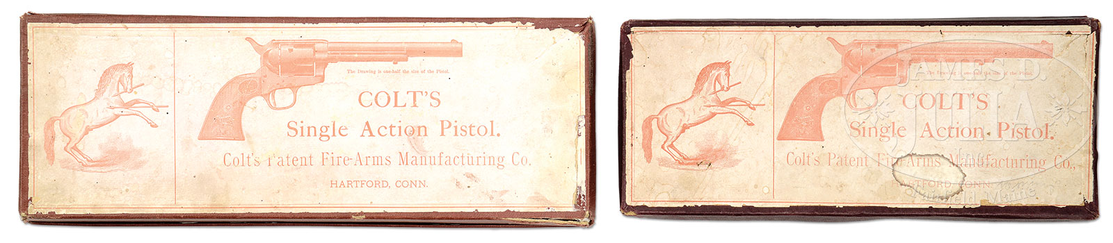 LOT OF 2 COLT FACTORY CARDBOARD BOXES FOR COLT SINGLE ACTION ARMY REVOLVERS.1) Box for a 7-1/2″ blue rubber grip 45 single action. Box is purple in color. Label on lid shows Rampant Colt on left; right side shows a picture of a black powder Single Action Army revolver with hard rubber eagle grips. Inside of lid has an advertisement for Ideal Reloading Implements. Inside of box has former owners name written. End label is blue. Bottom of box has pencil drawing of a Colt revolver with the former owner’s written in ink. Bottom of box also shows SN 136709. 2) Box for 4-3/4″ Colt Single Action Army revolver with blue finish and rubber grips. Box is purple in color. Label on lid shows a Rampant Colt on left; right side shows a picture of a black powder Single Action Army revolver with hard rubber eagle grips. Blue end label shows bbl, Cal., grips and finish. Inside of lid has advertising for Ideal Reloading Implements. PROVENANCE: The spectacular collections of Ray Bentley featuring the finest and rarest deluxe antique Winchesters in the world. CONDITION: 1) Very good. Labels are intact, slight frayed on the edges with some crazing and some light staining. One corner of lid has a break, but the balance is intact. 2) Very good. Labels are intact with some fraying and one water stain on top label. Bottom of box has a break and balance is intact. A rare opportunity to obtain two 19th century Colt boxes that could house a vintage revolver. 53094-144 TEP (2,500-3,000) – Lot 2272