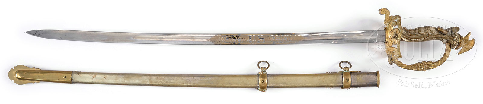 Please Note: There was a typographical error. The estimate should be $4,000-$5,000. HIGH GRADE STATUE GRIP MILITIA OFFICER’S SWORD OF CAPTAIN HENRY FALES, MAYHEW GUARDS, 10TH MASSACHUSETTS VOLUNTEER MILITIA.31-1/2″ lustrous Clauber blade with gold highlighted 9″ patriotic panels mounted in silver-plated solid brass scabbard with gilt relief mounts. Hilt features a full standing silver-plated Indian maiden wearing tobacco leaf skirt. Pommel exhibits a full relief American eagle on patriotic shield. This is quite an ornate Civil War era surplus sword with “1873” presentation. PROVENANCE: The spectacular collections of Ray Bentley featuring the finest and rarest deluxe antique Winchesters in the world. CONDITION: Very fine overall. Blade retains virtually all its orig luster with only minor blemishes. Hilt and scabbard and mountings retain about half of their orig silver and gold plating. Drag is missing its retaining screw. 53094-150 (4,000-5,000) – Lot 2290