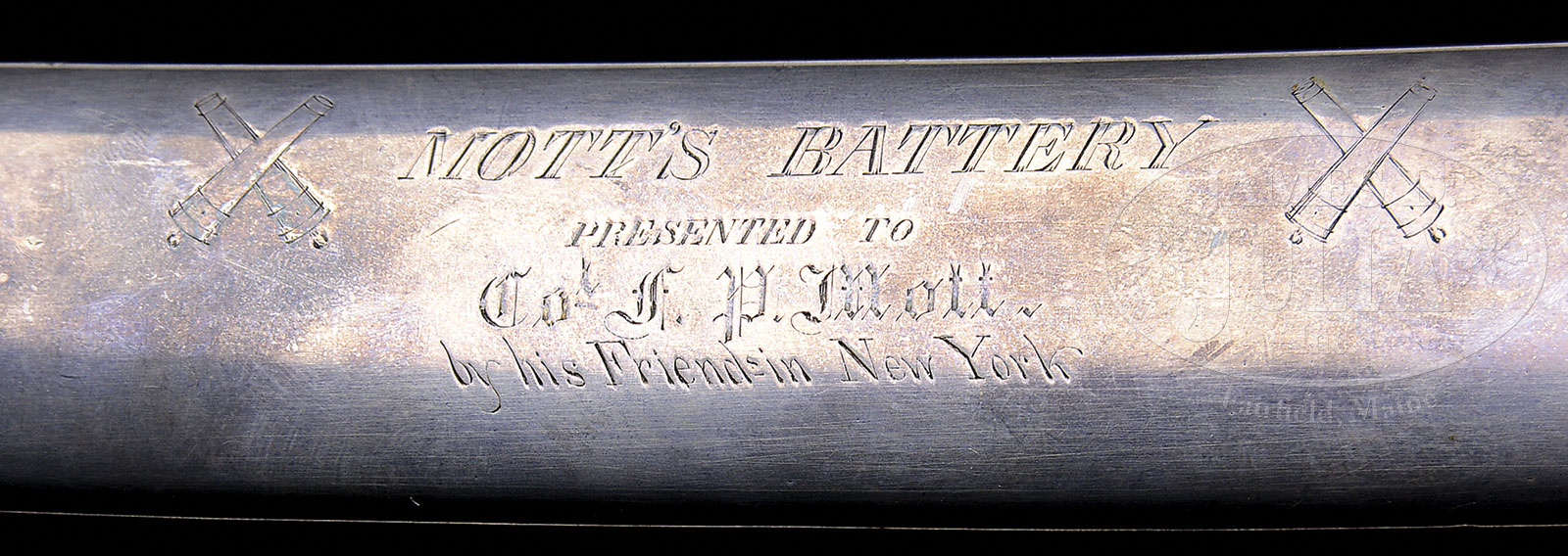 HIGH GRADE CIVIL WAR PRESENTATION SWORD TO THADDEUS P. MOTT, MOTT’S BATTERY, 3RD NEW YORK LIGHT ARTILLERY.High grade Clauberg presentation sword sold by W. J. Syms & Brothers, New York. Silver scabbard body has presentation between mounts with crossed cannon on either side “MOTT’S BATTERY / PRESENTED TO COL. T.P. MOTT BY HIS FRIENDS IN NEW YORK”. The opposite side of scabbard lists 12 Civil War generals who Mott probably served under in a most unusual presentation panel as can be seen in photos. Mounted officer’s saber has decorated fluted silver grip with brass wire and each scabbard mount has silver patriotic raised relief device including crossed pair of cannon on middle mount. The two fullered blade with gold background has patriotic etched panels including motto “IN HOC SIGNO VINCES”. Thaddeus P. Mott (1831-1894) was a well known Civil War officer and later an adventurer and soldier of fortune, holding the rank of Major General in the Egyptian Army after the war. Prior to the Civil War, Mott fought under Garibaldi in Revolutionary Italy. After his Italian service, he served as an officer on several clipper ships bound for California and fought in the Mexican Army 1856-1857 prior to his return to New York City. A large bound file of research accompanies this sword, including the January 16, 1954 receipt given to William C. Baker, III, son of General William C. Baker who purchased the sword from a shop on Wisconsin Avenue in Washington, DC. PROVENANCE: Hobby Shop, Washington, DC; William C. Baker, III, 1954; Clarence F. Runtsch Collection, 1965; The spectacular collections of Ray Bentley featuring the finest and rarest deluxe antique Winchesters in the world. CONDITION: Very fine overall. 34-1/2″ blade retains much of its orig luster with some staining and about 80% dull gold highlights with cleaning. Silvered scabbard body grip and silver section of mounts retain good detail and silver patina. Brass relief mounts, guard and pommel have traces of gilt in protected areas. 53094-153 JS (4,000-5,000) – Lot 2287 Click here to view provenance