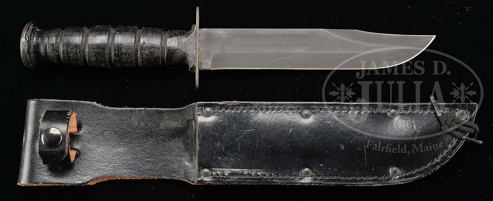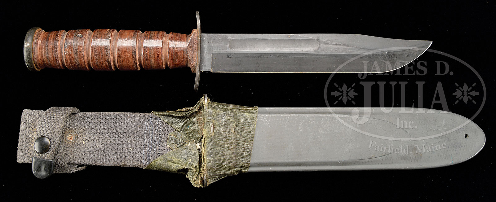 GROUP OF 10 EXTREMELY FINE WWII MILITARY KNIVES.1) USN MK1 by PAL, aluminum pommel in composite scabbard. 2) USN MK3 by Case dated 1943. Like new in a leather scabbard. 3)-5) MK4 bayonet; two by Case, 1 by Utica. 6) USMC MK2 by Camillus. 7) MK2 by Camillus. 8) MK2 Ontario. 9) & 10) MK2 Ka-Bar; one with blade mark, one with guard mark. PROVENANCE: The spectacular collections of Ray Bentley featuring the finest and rarest deluxe antique Winchesters in the world. CONDITION: Knives overall are very fine, as are the associated scabbards, pitting in Ka-Bar mark on 9). 53094-174 JS (1,500-2,000) – Lot 2378