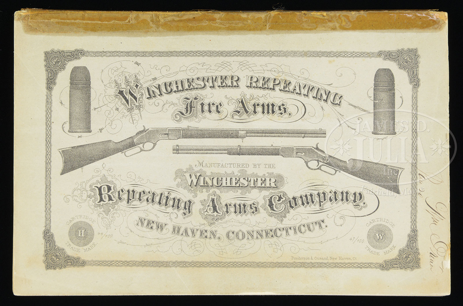 WINCHESTER TARGET SHOOTING INSTRUCTION MANUAL AND LOG BOOK.Cover of log book shows Winchester logo flanked by Henry flat cartridges over a Model 66 rifle and 66 carbine pointed in opposite directions. Book contains sample targets and shooting instructions. Rear flyer shows sectional drawing of Winchester Model 66 “Improved Henry” rifle. PROVENANCE: The spectacular collections of Ray Bentley featuring the finest and rarest deluxe antique Winchesters in the world. CONDITION: Very good. Cover, sectional drawing and pages are clean. Binding shows an old scotch tape repair. 53094-192 TEP (2,000-3,000) – Lot 2234