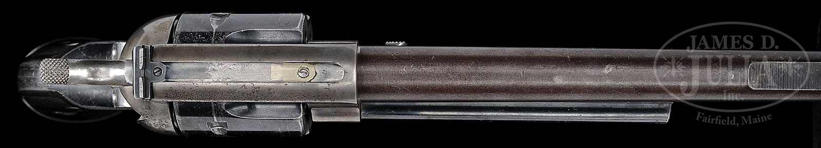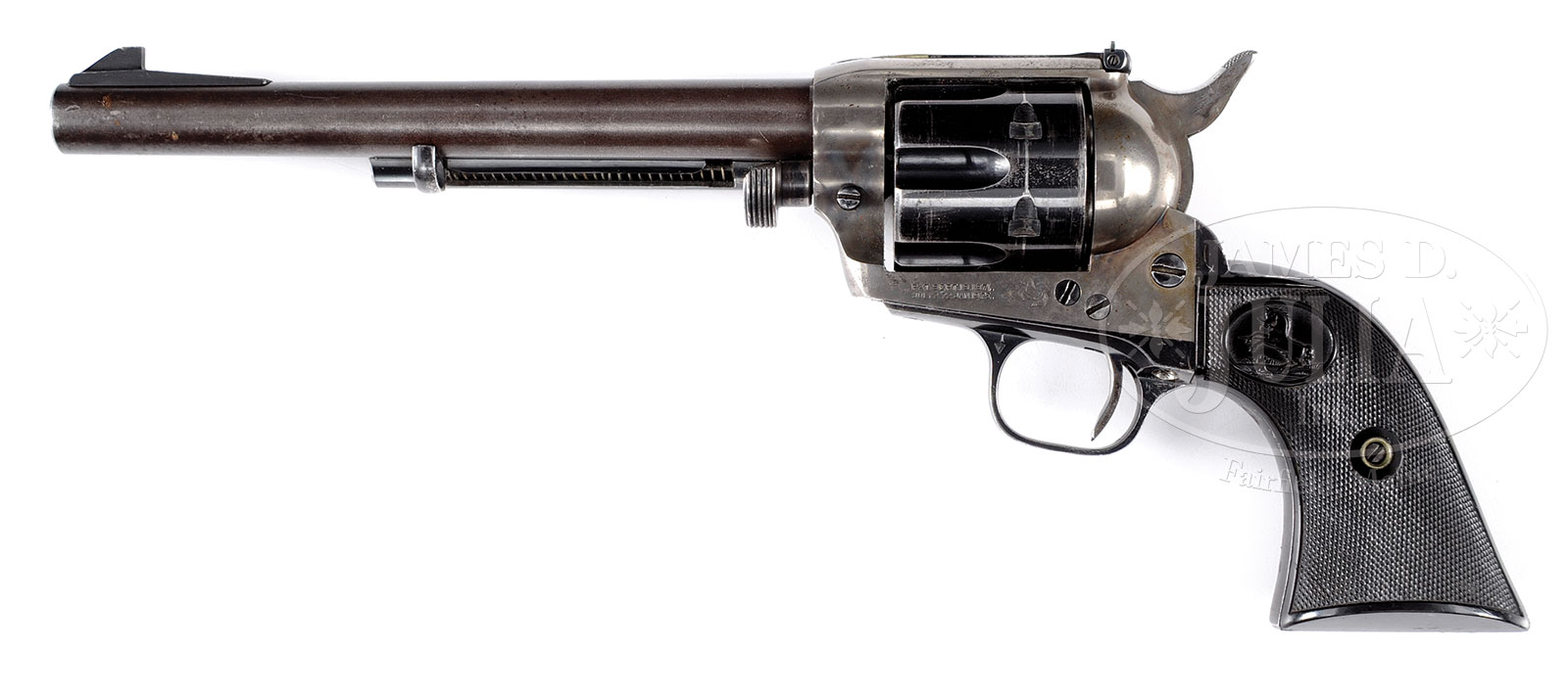 *COLT SINGLE ACTION ARMY REVOLVER CONVERTED TO 22LR CALIBER.SN 352369. Cal. 22 LR. 7-7/16″ bbl, blue and case color finish, 2-pc checkered hard rubber grips with Colt medallions. This revolver has been professionally converted from a large bore center fire Cal. to 22LR Cal. Bbl has been replaced with a non-Colt product. Cyl has been bushed to 22 Cal.. Frame bushing has been altered along with firing pin to rim fire Cal. A ramp front sight has been installed; an adjustable rear sight has been installed into top of frame. Cyl pin has been replaced by a custom large head type. Bbl is unmarked. SN is stamped on frame and inside of trigger guard and backstrap. SN’s match. Matching SN is also scratched on inside of each grip. Right rear trigger guard bow shows an “&” which indicates return to factory for repair. Conversion does not appear to factory work. Cyl has “U” stamped on front face. PROVENANCE: The spectacular collections of Ray Bentley featuring the finest and rarest deluxe antique Winchesters in the world. CONDITION: Very good. Bbl shows grey/brown patina overall with some dents and mars. Front ramp sight is good. Bore is frosty with visible rifling. Frame retains traces of case color finish. Loading gate fits. Trigger guard and backstrap retain 20-30% blue finish with handling marks and wear overall. Cyl retains considerable amount of blue finish with some scratches around periphery and light drag mark between bolt stops. Mechanics are crisp. A very interesting Colt six shooter that was converted to 22LR by a competent gunsmith. 53094-20 TEP (1,000-1,250) C&R – Lot 2270