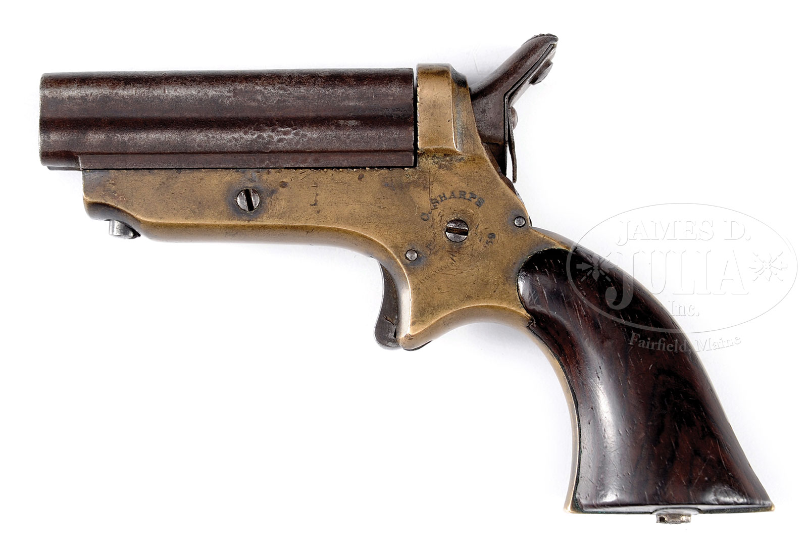 SHARPS MODEL 1C PEPPERBOX PISTOL.SN 3637. Cal. 22 RF. 2-1/2″ bbl, blue and silver finish, plain wood grips. Bbl cluster shows SN stamped on bottom and butt of frame, numbers match. Left side of frame is marked “C. SHARPS & CO PHILADA. PA.” and right side is marked “C. SHARPS PATENT 1859”. PROVENANCE: The spectacular collections of Ray Bentley featuring the finest and rarest deluxe antique Winchesters in the world. CONDITION: Very good. Bbl cluster shows a deep mottled grey/brown patina overall with some minor dents. Bores are dark. Frame retains traces of silver in protected areas. Right side of frame mark is sharp; left side is partially washed out. SN is sharp. Grips are good with considerable varnish left. Grips have high-point wear and scratches overall. Mechanics are crisp. A nice example of an early Sharps Pepperbox pistol. 53094-67 TEP (100-125) – Lot 2318