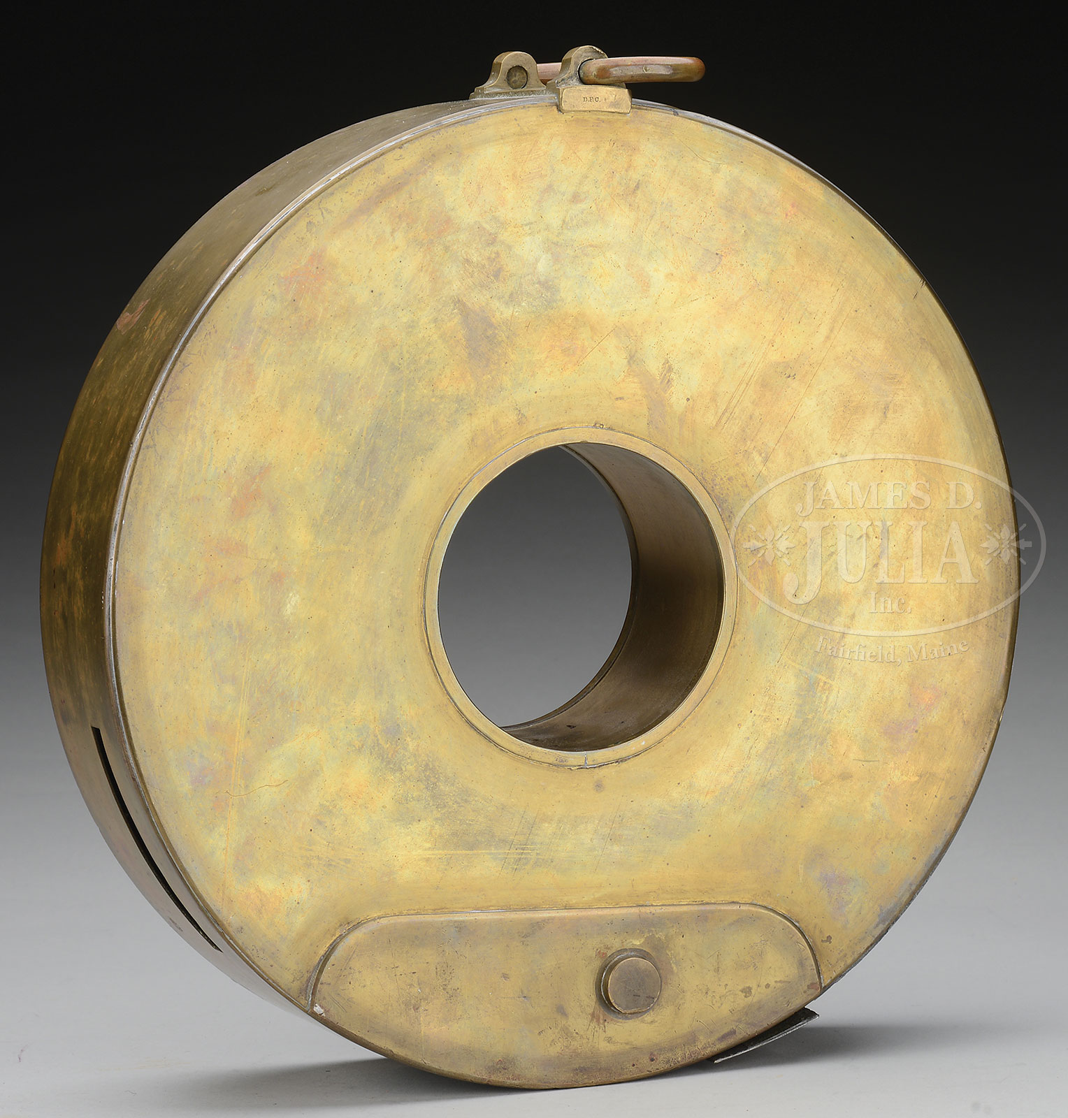 1883 COLT GATLING GUN ACCLES FEED DRUM.Drum is of the rotary type with steel slides and brass housing. Drum is marked on hinged handle “D.F.C.” for US Army inspector David F. Clark. There is a brass handle on top. Drum accommodates 104 rounds of ammunition. PROVENANCE: The spectacular collections of Ray Bentley featuring the finest and rarest deluxe antique Winchesters in the world. CONDITION: Very good. Drum shows a mustard patina overall with handling marks and some separation on side toward feed mouth. Index lock functions. A welcome addition to a Gatling Gun collection. 53094-70 TEP (3,000-5,000) – Lot 2108