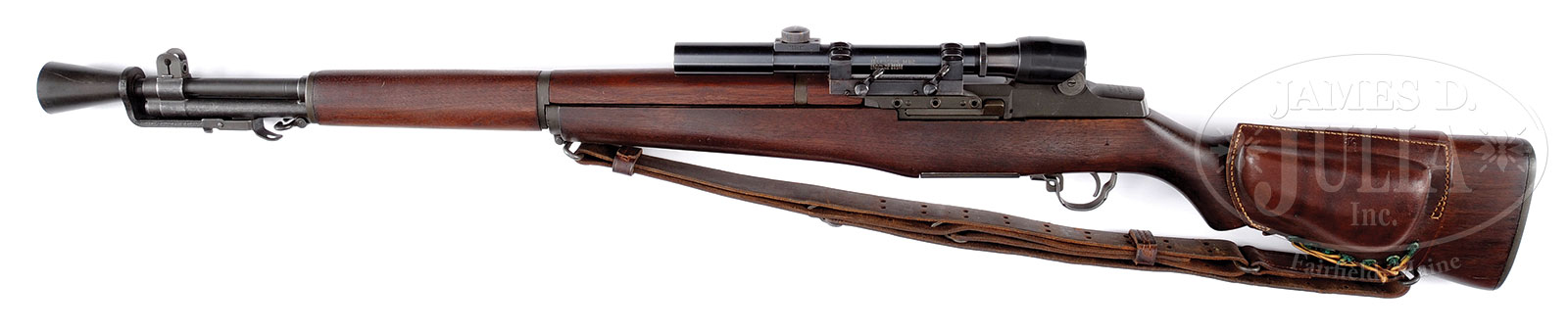 *VERY FINE & RARE 1945 SPRINGFIELD M1C GARAND SNIPER .30-06 RIFLE WITH M82 SCOPE.SN 3373483. Cal. .30-06. 24″ bbl. Standard markings. 3-45 dated bbl. Drawing numbers are consistent with bbl and receiver dates. Proper “S.A./N.F.R.” and ordnance wheel cartouches. Circle P firing proof behind trigger guard. Lock bar rear sight. Proper scope rail mounted on side receiver. Proper Griffin & Howe scope mount. Proper M82 scope with post reticle. SN on right side of scope mount is 162 numbers off from the receiver SN. All correct drawing numbers on scope. Proper leather eye cup and sun shield. “K/ LINE” marked leather cheek rest. “MILSCO/ 1944” marked brown leather sling. “SA/ HIDER FLASH M 2” marked flash hider. PROVENANCE: The spectacular collections of Ray Bentley featuring the finest and rarest deluxe antique Winchesters in the world. CONDITION: Very fine with light finish wear from handling. All markings clear. Wood is fine with slight handling marks, cartouches on left side lightly stamped. Slight discoloration from leather cheek rest. Bore is excellent with sharp rifling. Mechanics are crisp. Optics are dusty but fine. Condition of flash hider is consistent with gun. 53094-95 GER (7,500-9,500) C&R – Lot 2355