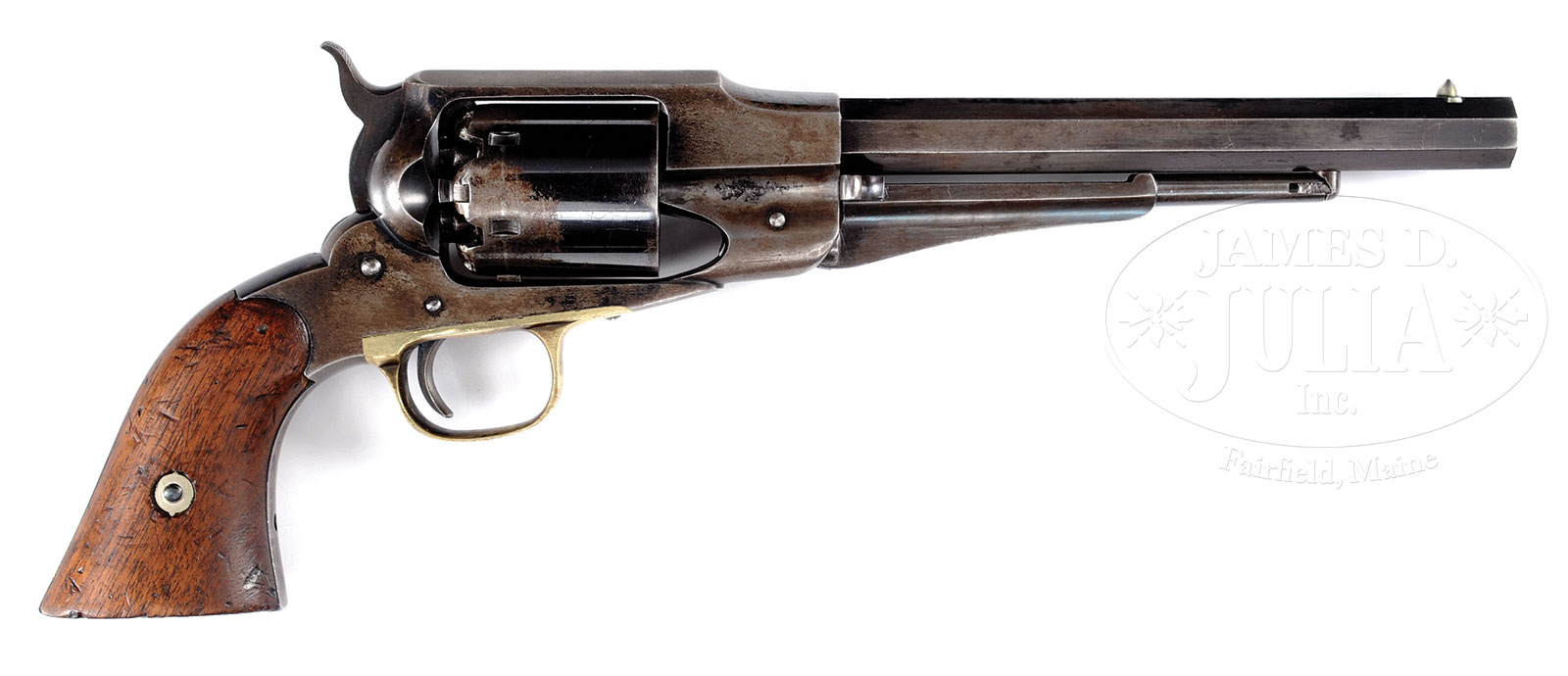RARE REMINGTON OLD MODEL 1861 ARMY TRANSITIONAL REVOLVER MILITARY ISSUE.SN 3601. Cal. 44. 8″ bbl, full blue finish, 2-pc walnut grips. Bbl shows 2-line Remington patent and address rolled on top flat. German silver cone front sight, SN is stamped on bottom flat of bbl, on inside of left grip frame and rear face of cyl. Numbers match. Illegible pencils marks appear on inside of grips. Inspector initials “WC” are stamped at left breech of bbl and on frame adjacent to marks on bbl. “W” is stamped on front of trigger guard. “B” is stamped on rear flat of trigger guard. “RJ” inspector marks appear on rear periphery of cyl between chambers. “R” is stamped on bottom of each grip. No inspector cartouches are visible. This particular revolver is a transition from the Remington-Beals Army revolver using the Beals type frame with concealed bbl threads at the breech. PROVENANCE: Fritz Baehr lifetime collection. CONDITION: Very good to fine for this model. Bbl retains 20-30% bright blue finish with balance flaked to a smooth grey/blue patina with some high-point wear. German silver cone front sight is very good. Bbl markings are sharp. Bore is bright. Loading lever retains 20% blue, especially in protected areas. Frame retains 30% bright blue finish, especially on left side with balance having flaked to a smooth grey/brown patina. All markings are sharp and clear. Hammer shows generous amount of case color, trigger shows generous amount of blue. Trigger guard has mustard yellow patina. Cyl also retains 50% blue with clear markings. After a failed attempt to mark SN on one flat, SN was stamped on two flats. Grips are very good, slightly undersized, and show numerous handling marks and dents overall commensurate with military use of pistol. Inspector initials are sharp and clear. Mechanics are crisp. Here’s your chance to obtain a very rare Old Model Army Remington transitional revolver from a very well known collection. 53096-10 TEP (2,500-4,000) – Lot 1342
