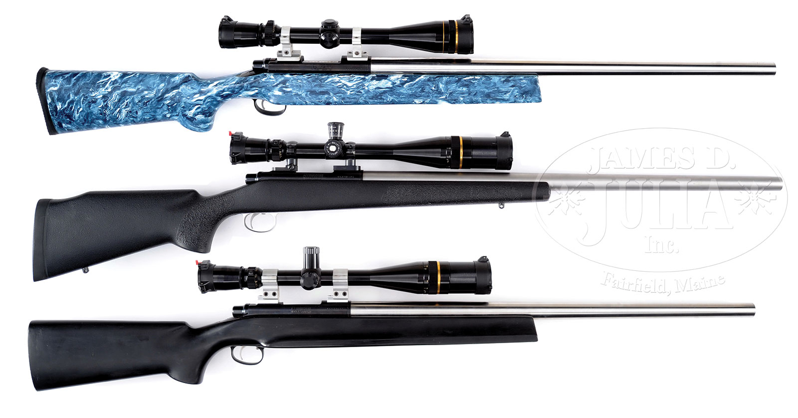 *MARKSMAN’S LOT OF THREE LONG-RANGE COMPETITION RIFLES.1) REMINGTON 700 LH. SN C6688261. Cal. .223. 26″ heavy stainless steel bbl marked “HAMMOND RIFLES”. Left hand Remington action with fine adjustable target trigger with single-shot adapter in mag. Mounted in a blue marbleized synthetic bench rest stock with evidence of proper glass bedding and free floating. Sayko pattern extractor conversion on bolt. Equipped with a Leopold Vary-X III 6.5×20 power scope with traditional fine Duplex reticle. Custom work appears to be of best quality. PROVENANCE: Daryl Middlebrook collection. CONDITION: Bore, rifling and throat are sharp and bright. Overall condition is very fine with light traces of typical target use. Optics are bright and mounted in precision quality long range rings and bases. Trigger pull is approx 2 ounces and rifle functions properly and all visible numbers matching. 2) REMINGTON 700 LH. SN C6494101. Cal. .22 Cheetah MK.1. 26″ tapered heavy bbl marked “CLARENCE HAMMAND”. Left hand Remington 700 short-action with adjustable target trigger and glass bedded into what appears to be a McMillan synthetic stock. Equipped with a Leopold Vary-X III 6.5×20 E.F.R. target scope with target knobs and mounted with Burris detachable steel rings. Has a removable single-shot adapter in mag box. Scope is missing target knob covers. PROVENANCE: Daryl Middlebrook collection. CONDITION: Very fine overall showing little evidence of actual use. Bore is bright and sharp as is throat. Trigger pull approx 2 ounces. Mechanics are fine and functioning. Numbers matching. 3) REMINGTON 700 LH. SN C6579655. Cal. .243 WIN/.270 N.D. 26″ heavy stainless steel bbl marked “SEELY MASKER” over chamber designation. Mounted in a Remington left hand short action with Sako-type converted extractor and converted to single-shot. With unknown stainless steel adjustable target trigger. Glass bedded into a black fiberglass bench rest pattern stock. Equipped with a Leopold Vari-X III 6.5×20 E.F.R. scope with target knobs. PROVENANCE: Daryl Middlebrook collection. CONDITION: Very fine overall with typical signs of light usage. Bore bright and shiny with sharp throat. Trigger pull tested at less than 1 ounce. Optics are clear with traditional fine Duplex reticle. A very high quality bench rest rifle. 53098-12, 53098-13, 53098-19 TDW (3,500-4,000) – Lot 3280