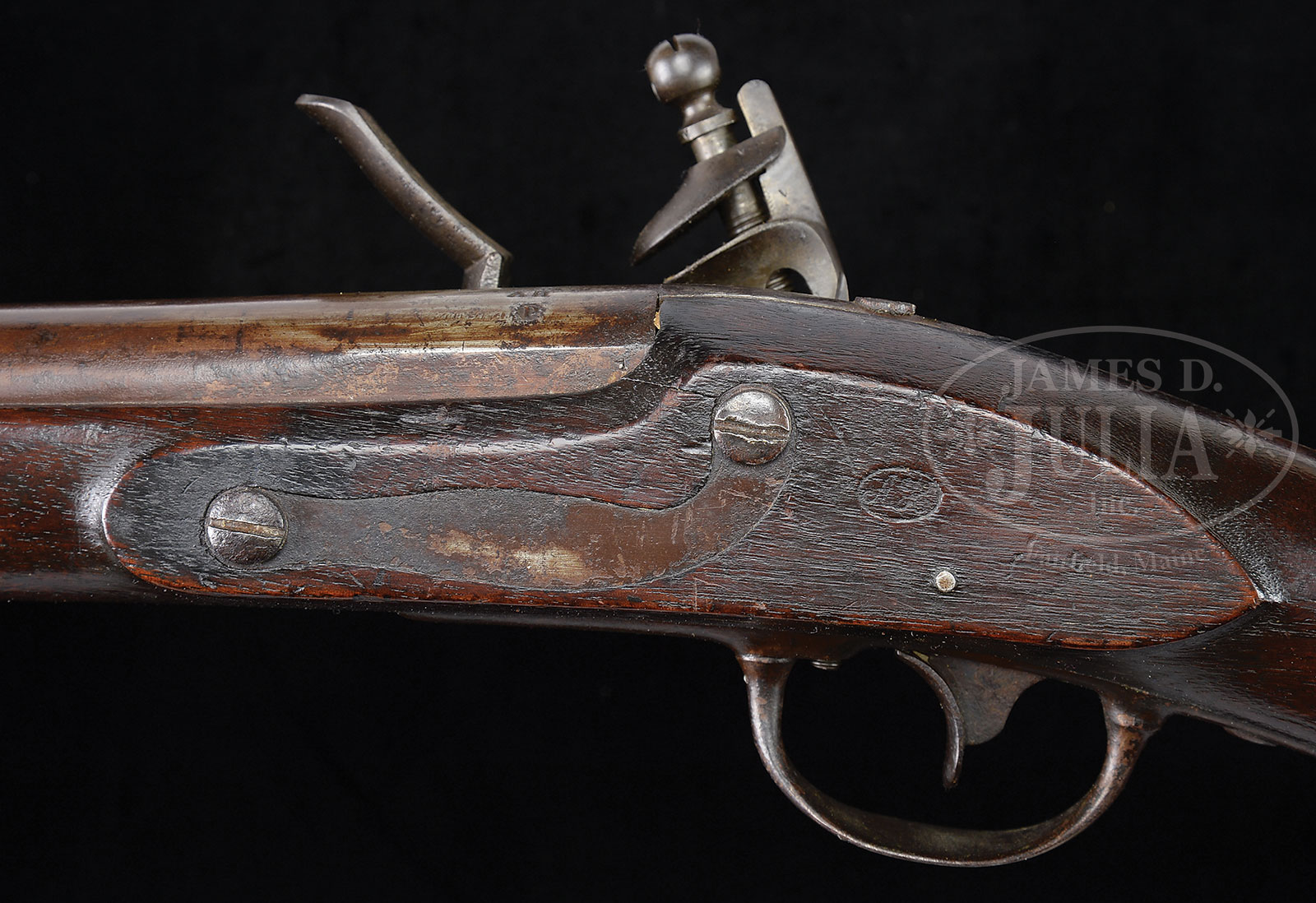 EXTREMELY FINE SAMUEL NORTH MODEL 1817 COMMON RIFLE.SN NA. Cal. 54. contract rifle with 36″ rnd bbl, square base front sight/bayonet lug with fixed rear sight. Bbl at breech “US / AH / P” proof marks and tang is dated “1827”. Lockplate is marked in front of hammer with a small “U.S. / S. NORTH” and back is marked vertically with date “1827” and “MIDLTN / CONN.” behind hammer. Mounted with a 1-pc walnut stock with iron furniture having three bands and a brass tipped iron ramrod. Right side of stock has the usual oval iron hinged-lid patchbox with a nearly flat musket style buttplate. Trigger guard is the usual type for this model with protruding tang toward bottom end to which is attached a sling swivel with a corresponding swivel on middle band. Stock is inspected with oval cartouche opposite lock “AH” (Asabel Hubbard). There are also small “H” inspector marks on bbl breech, also for U.S. Inspector Hubbard. CONDITION: Very fine overall. Gun appears orig, complete and matching. Bbl retains about half it’s orig thinning brown finish, bright brown under bands. Patchbox lid retains about 90% brown finish with staining and light pitting. Lock exhibits traces of muted case colors in protected areas. Bbl tang and tang screw are pitted but bbl date is bright. Stock is sound and solid with good edges and scattered cosmetic dings and dents unaffecting aesthetics. Mechanically crisp, with bright crisp rifled bore. 53106-3 JS (6,000-8,000) – Lot 1384 Click here to view provenance