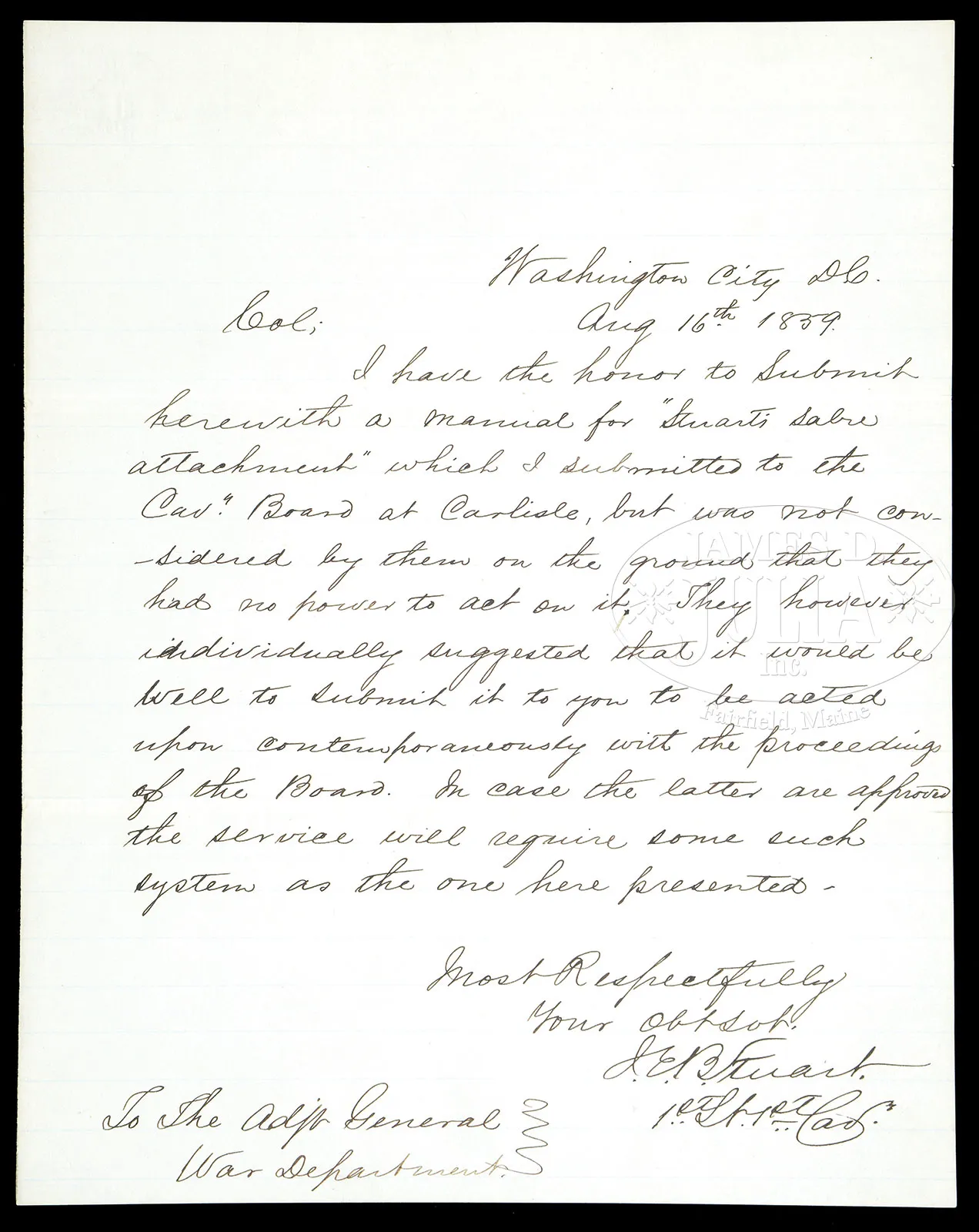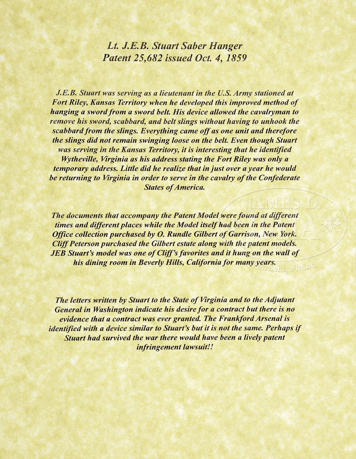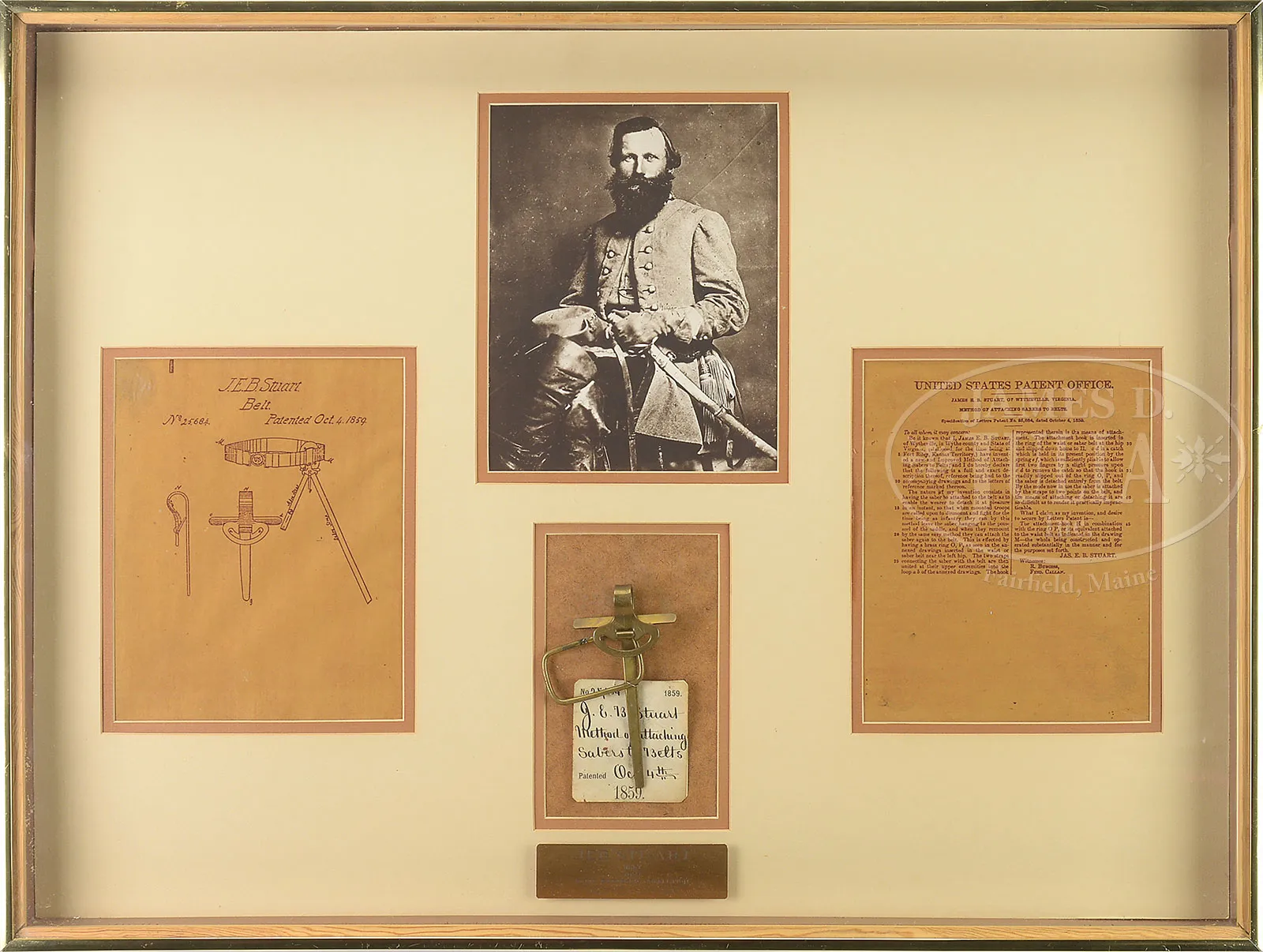 JEB STUART ARCHIVE INCLUDING HIS ORIGINAL PATENT MODEL AND PATENT FOR HIS FAMOUS SWORD HANGER.JEB Stuart is a household name and among the best known of all Confederate commanders. His cavalry exploits during the Civil War and his prior service on the Plains and Bleeding Kansas are well known among military historians. Few know, however, that JEB Stuart designed and patented an innovative sword hanger just prior to the war. This lot contains: 1) his orig submitted brass working model along with the orig patent office tag, patent number 25, 264 “J.E.B. STUART / METHOD OF ATTACHING / SABERS & BELTS / PATENTED OCT. 4TH / 1859”. 2) 16″ x 10-1/2″ printed circular describing the belt with full page drawing of the device, on verso full page ALS, Ft Riley, Kansas Territory, January 25, 1860 by Stuart to State of Virginia encouraging purchase of his device for state troops since the US government had adopted it. 3) 1-pg ALS from Stuart to Adjutant General, War Department, Washington, August 16, 1859 “I have the honor to submit herewith a manual for Stuart’s Sabre Attachment which I submitted to the Cavalry Board at Carlisle… J.E.B. Stuart 1st Lt. 1st Cav.”. James Ewell Brown Stuart (1833-1864) known to his friends as JEB, graduated from West Point in 1854. He was among the best American officers serving in Texas and Kansas with the US Army prior to the Civil War and was a participant in the capture of John Brown at Harper’s Ferry. He resigned his commission in the U.S. Army when the war began and distinguished himself in numerous battles. As Confederate commander, Stuart would be killed at the Battle of Yellow Tavern, May 12, 1864 at the age of 31 by a member of Custer’s Michigan Cavalry Brigade. Robert E. Lee now truly lost his eyes and ears for the Army of Northern Virginia. This is an incredible archive concerning the most iconic of American cavalry commanders, none better known than possibly George Armstrong Custer. It is amazing that Stuart’s patented sword hanger was rare during the Civil War but saw expanded used after the Civil War in the Indian Wars being manufactured at the Frankford Arsenal almost exactly in the same configuration he designed. PROVENANCE: Patent Model sold at auction by US Patent Office to O. Rundle Gilbert, Garrison, New York; Cliff Peterson, Beverly Hills, CA; Henry Truslow Collection, Sunbury, PA. CONDITION: 1) Fine overall as framed in 32″ x 24″ shadowbox. Brass hanger measures 5″ x 3″. The orig 3″ x 3″ patent card is also very good to fine with dark easily discerned text with light soiling. Frame also contains 7″ x 10″ printed US Patent Office description and drawing of patented device, along with a facsimile photograph of Stuart. 2) Cracked at folds with reductions at central folds, foxing, acid burn, paper brittle but otherwise complete and sound as professionally conserved. Scotch tape stains on same central fold darkening paper where tape removed. Chipping and brown edges at top and bottom barely effecting text. Stuart signature panel is fine. Ink and print all dark and easily discerned. 3) Very fine overall. Creases at folds. Bright, dark ink on laid lined paper. 9-3/4″ x 7-5/8″. 53112-1 JS (20,000-25,000) – Lot 1362 Click here to view provenance