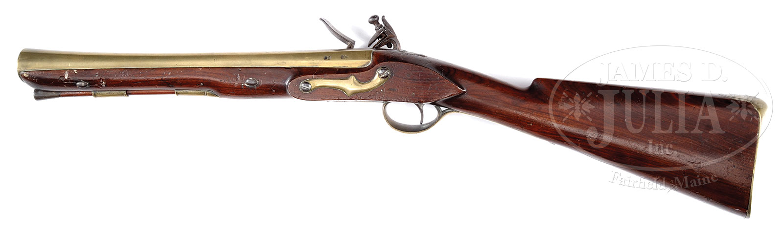 BRASS BARRELED FLINTLOCK BLUNDERBUSS BY HENRY MORTIMER, LONDON, CIRCA 1810.NSN. Cal. 20 BORE. 29″ overall, 14″ brass flared cannon bbl with oct-rnd breech section engraved “H.W.MORTIMER LONDON, GUN-MAKER TO HIS MAJESTY” and marked with commercial proofs, swamped bbl flares to 1″ at muzzle. High quality chamfered lock engraved “H. W. / MORTIMER” and is fitted with integral pan, bridled roller frizzen and high breasted serpentine cock, missing its sliding safety. Nicely streaked European walnut straight grip stock extends to flare of bbl. Stock is brass mounted with engraved buttplate, trigger guard with pineapple finial and two ramrod thimbles. Ramrod appears orig with iron threaded worm and horn tip. Mortimer was well known for supplying weapons for the royal mail coaches for which this weapon was probably made. CONDITION: Very good overall. All brass parts show old cleaning, and are a light mustard patina, engraving still sharp and clear. Lock shows some darkening and light pitting. Lock and frizzen springs are crisp. Stock retains much of its orig oil finish with hand worn patina with scattered cosmetic defects. Other than missing sliding lock safety, gun appears all orig and authentic. Mechanics are crisp with fine smooth bore. 53120-1 (2,500-3,500) – Lot 3126