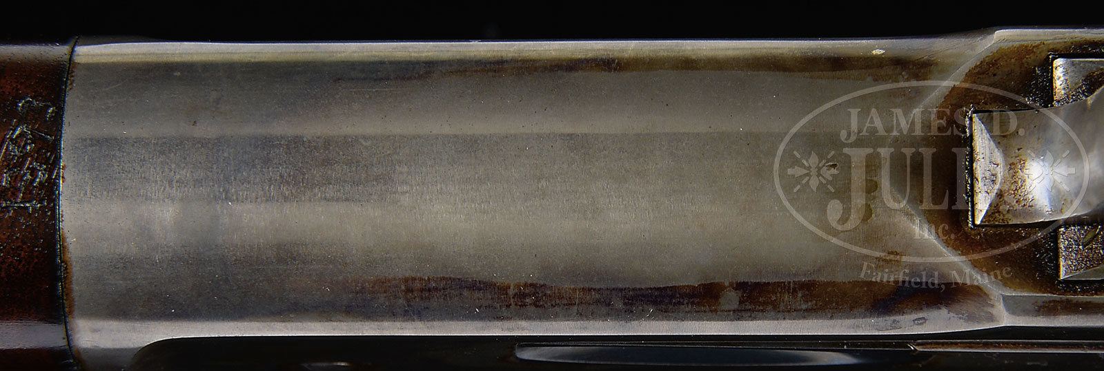 FINE DELUXE 1886 LEVER ACTION RIFLE.SN 70258. Cal. 38-56. Beautiful deluxe ’86 with 26″ oct bbl, full magazine, Lyman sporting front sight with bead missing and semi-buckhorn rear sight. Top flat of bbl has standard 2-line Winchester address with caliber marking over the chamber area. Top tang is marked “MODEL 1886”. Mounted with very nicely figured, center crotch, flame grain American walnut with H-style checkered forearm and black insert, serpentine grip buttstock and crescent buttplate without trap. Left side of lower tang is marked with the assembly no. “355” & “XX”. Matching assembly no. is also found in top tang channel of buttstock & inside toe of buttplate. Bottom of forearm, at the receiver has the hand carved date “1893”. This rifle was produced in the 1892-1893 period and was probably someones prized hunting rifle. Firearms of that era most often saw hard service, frequently under harsh conditions, sometimes with little or no maintenance. CONDITION: Fine, all matching. Bbl & magazine tube retain about 95% strong orig blue, showing only sharp edge wear, a couple of small scratches & dings with some minor thinning on bottom of magazine tube. Receiver retains about 70% orig case colors, strong & bright in sheltered areas, fading elsewhere and turned silver on the belly. Belly of the receiver still shows most of the “2nd coat lines”. Top & bottom tangs retain strong case colors. Hammer retains bright case colors, turned silver on the spur. Lever retains lightly to moderately faded case colors, brilliant in sheltered areas, turning silver on outer faces. Buttplate & forend cap have mostly turned silver with smoky colors showing through. Wood is sound with some heat pimpling on the right side of buttstock with a few light nicks & scratches and retains most of its strong, orig piano varnish finish. Mechanics are crisp, very bright shiny bore. 53158-2 (12,500-17,500) – Lot 2406