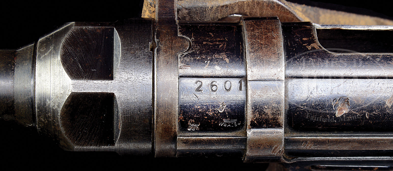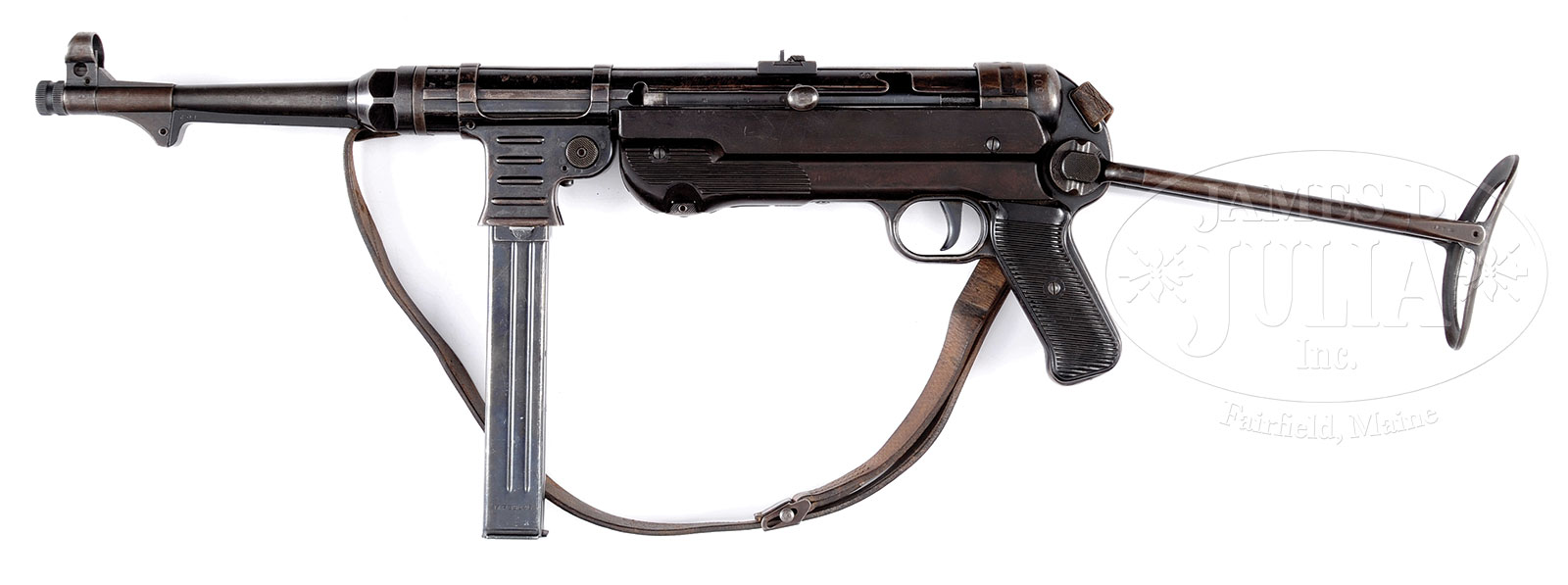 **EVER POPULAR ALWAYS COLLECTIBLE MATCHING GERMAN WWII MP-40 MACHINE GUN (CURIO & RELIC).SN 2601J. Cal 9mm. 9.9″ bbl. Very nice curio and relic eligible “ERMA” manufactured receiver with CG Haenel matching rear assembly. Visible numbers appear matching with typical mixture of subcontracted parts which was common practice as the Germans produced these machine guns. Bolt is ERMA as is bbl, front sight by Merzwerk with end cap by Krupp. For those familiar with the MP-40 this is a classic C&R gun which includes one orig magazine and orig leather sling. Shoulder stock employs properly and quite tight when extended. The MP-40 was the successor to the MP-38 model. Both were intended to be compact bust fire power weapons especially suited for dismounted vehicle troops but was issued in ever increasing numbers to troops of all kinds. It is slow firing, comfortable to shoot, durable, with readily available parts. This is a National Firearms Act item and requires BATF approval prior to transfer. This weapon is fully transferable on an ATF form 3 or form 4 as Curio & Relic eligible. CONDITION: Overall appearance and finish very good to fine with several dings and scars to bare gray patina metal, particularity at the high points, otherwise turning a brown patina. Bakelight of lower assembly fine to very fine. Left grip panel has a slight crack near trigger guard but still completely strong and serviceable. Mechanics are fine. Fine right bore with minor pitting in the grooves. Orig sling soft, strong and serviceable. “fxo 42” marked magazine. The MP-40 has been popularized not only by veterans who brought them back, but also by WWII films over the years. Matching curio and relic specimens are highly sought after collectors items and they also make a great entry level machine gun. 53165-3 JWK (15,000-20,000) C&R – Lot 1021