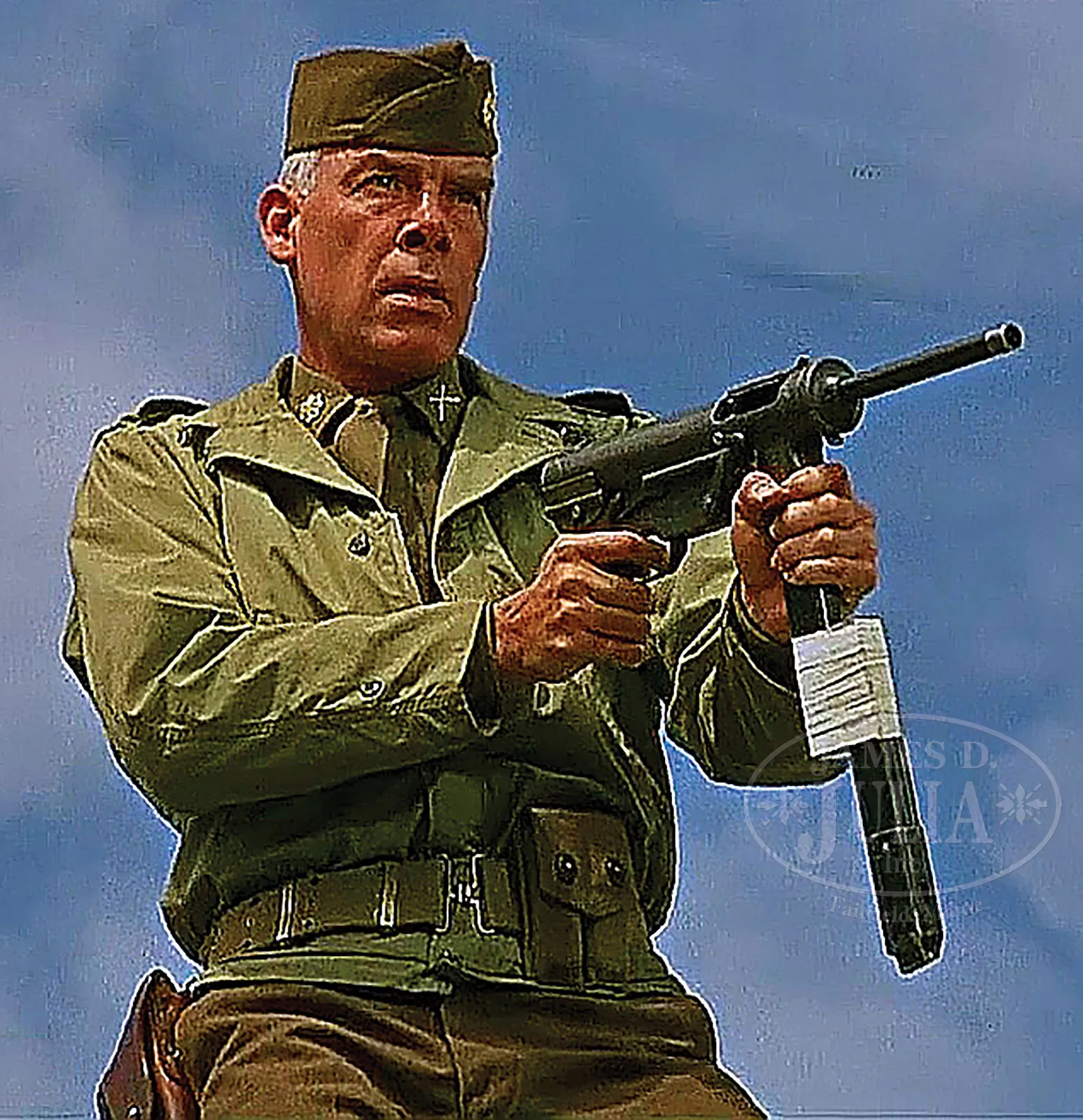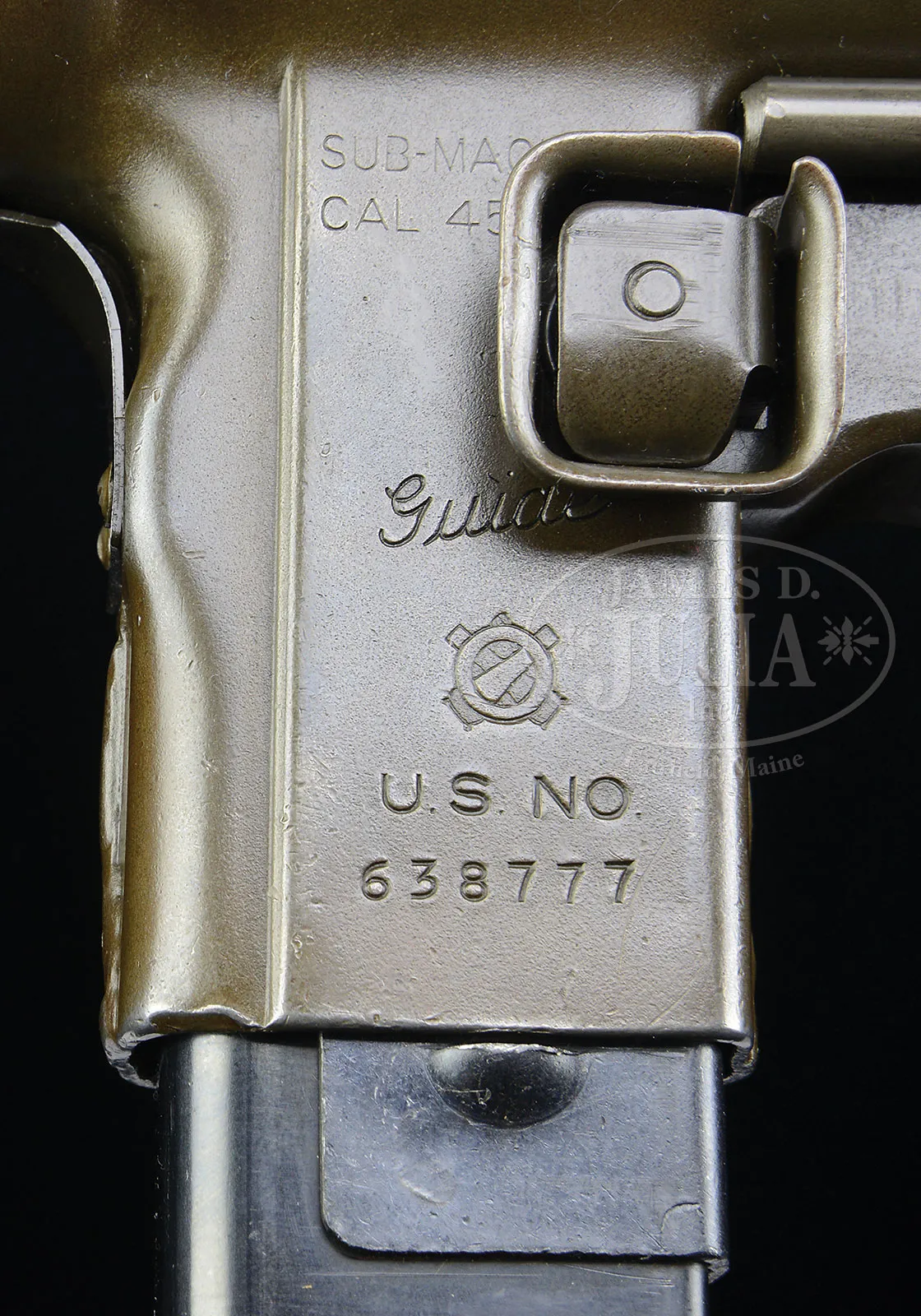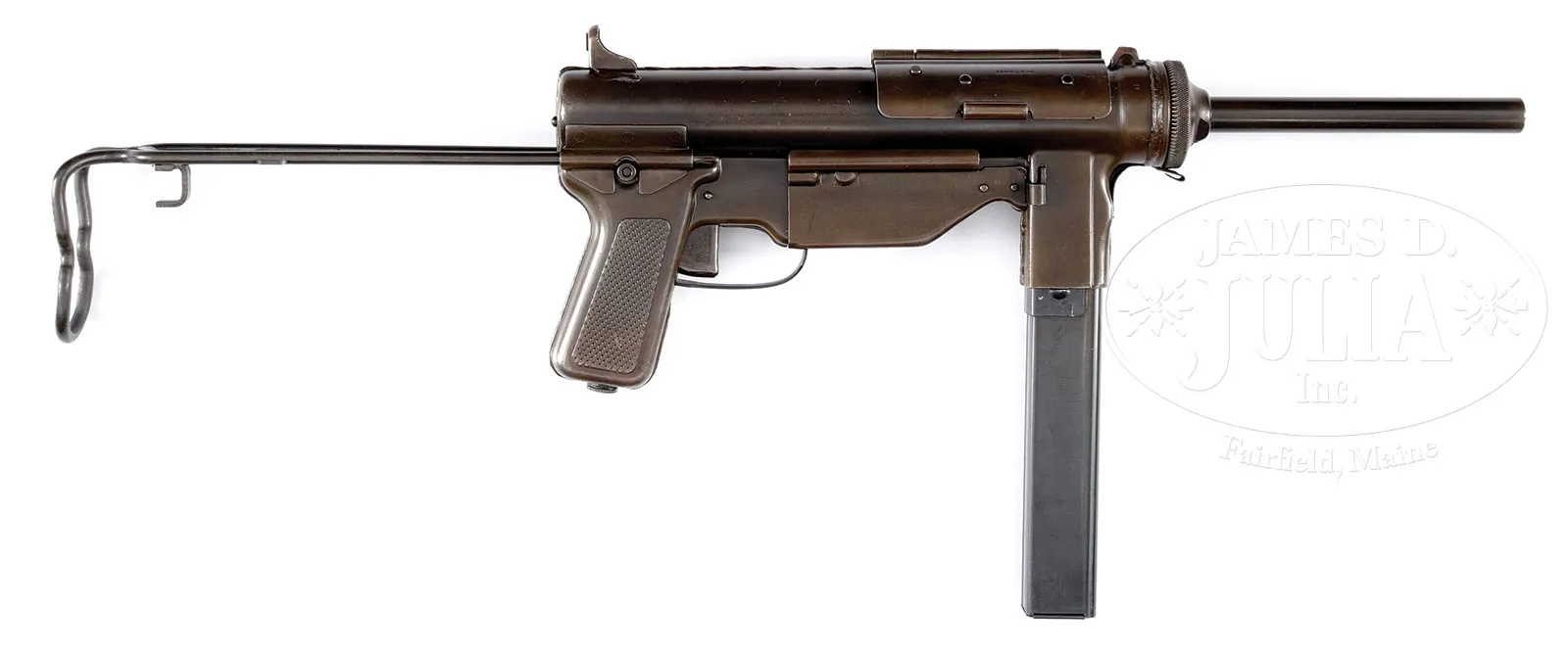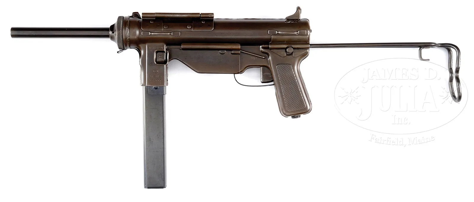 **EXTREMELY SCARCE AND HIGHLY SOUGHT GUIDE LAMP M3 A1 GREASE GUN (CURIO & RELIC).SN 638777. Cal. 45 ACP. 8-1/8″ bbl. Very attractive and well made M3A1 grease gun by Guide Lamp complete with US ordnance markings on left side of magazine well. Mag well SN is the only visible SN. Includes one 30 round magazine. This model cocks by opening the ejection port housing cover and pulling back the bolt using a recessed area on the bolt itself. Telescoping wire shoulder stock, fixed peep sights, and all steel construction made this the must less costly successor to the Thompson and rising sub-machine guns of WWII. It has an interesting safety mechanism that when the bolt is back and the ejector port cover is closed, a tab on the cover holds the bolt in the rear position, even when the trigger is actuated. One must open the ejector port cover in order for the bolt to move forward and fire. Although produced in great numbers and widely used, relatively few specimens made it into the National Firearms Act registry as curio and relic eligible fully transferable to individuals. This is a National Firearms Act item and requires BATF approval prior to transfer. This weapon is fully transferable on an ATF form 3 or form 4 as Curio & Relic eligible. CONDITION: Very fine with a smooth dull gray green re-finish with a soft, felt like material inside the ejector port cover. Some brassing and thinning to the finish particularly at the high points with the occasional scratch and pin prick pitting visible under the finish. Mechanics are crisp. Bore is fine to very fine. While the Thompsons are exceedingly popular collectors items, the US military grease gun is actually just as if not more comfortable to shoot and has been increasingly sought after as a item of collector’s interest, especially after the premiere of such films as “The Dirty Dozen”. 53165-7 JWK (18,000-28,000) C&R – Lot 1000