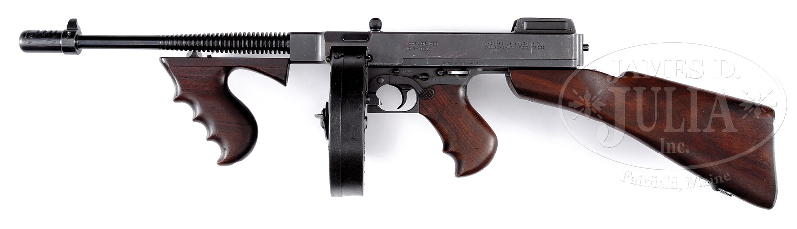 SN S-93310. Cal. 45 ACP. 12-1/2″ bbl with dual logo Cutts compensator. Scarce Savage manufactured commercial Thompson Model 1928 with Thompson logo forward of rear sight and also on Cutts compensator on left side. Compensator also exhibits Cutts diamond logo at top front. Upper and lower assemblies match SN. Savage proofed bbl. Detachable wood buttstock with sling swivel has faint outline of what appears to be a rack number “58”. Includes one orig 50 round “New York N.Y.” 1920s patent date drum magazine, and one 20 rnd Seymour magazine. The Savage manufactured 1928 Thompson machine guns are widely held as the most durable of the manufactured Thompsons. This specimen has particularly attractive wood and high luster finished bbl with du-lite finished receiver and lower assembly. This is a National Firearms Act item and requires BATF approval prior to transfer. This weapon is fully transferable on an ATF form 3 or form 4 as Curio & Relic eligible. CONDITION: Overall finish and appearance extremely fine. High lustrous orig blued finish on bbl and compensator with extremely fine dull du-lite finish on receiver, grip frame, and forend iron. Somewhat of a plum finish around magazine well due to the metallurgical hardening in that area. Wood is very fine to extremely fine with some very light handling marks. Mechanics are crisp. Bolt is very clean and bright. Very fine to extremely fine brilliant bright bore. Drum exhibits a somewhat dull refinish over light pitting which presents very well with this gun. It is not often one finds this model available in such nice, clean condition. The orig vintage 50 round N.Y. drum is a definite plus. 53165-8 JWK (24,000-30,000) C&R – Lot 1077