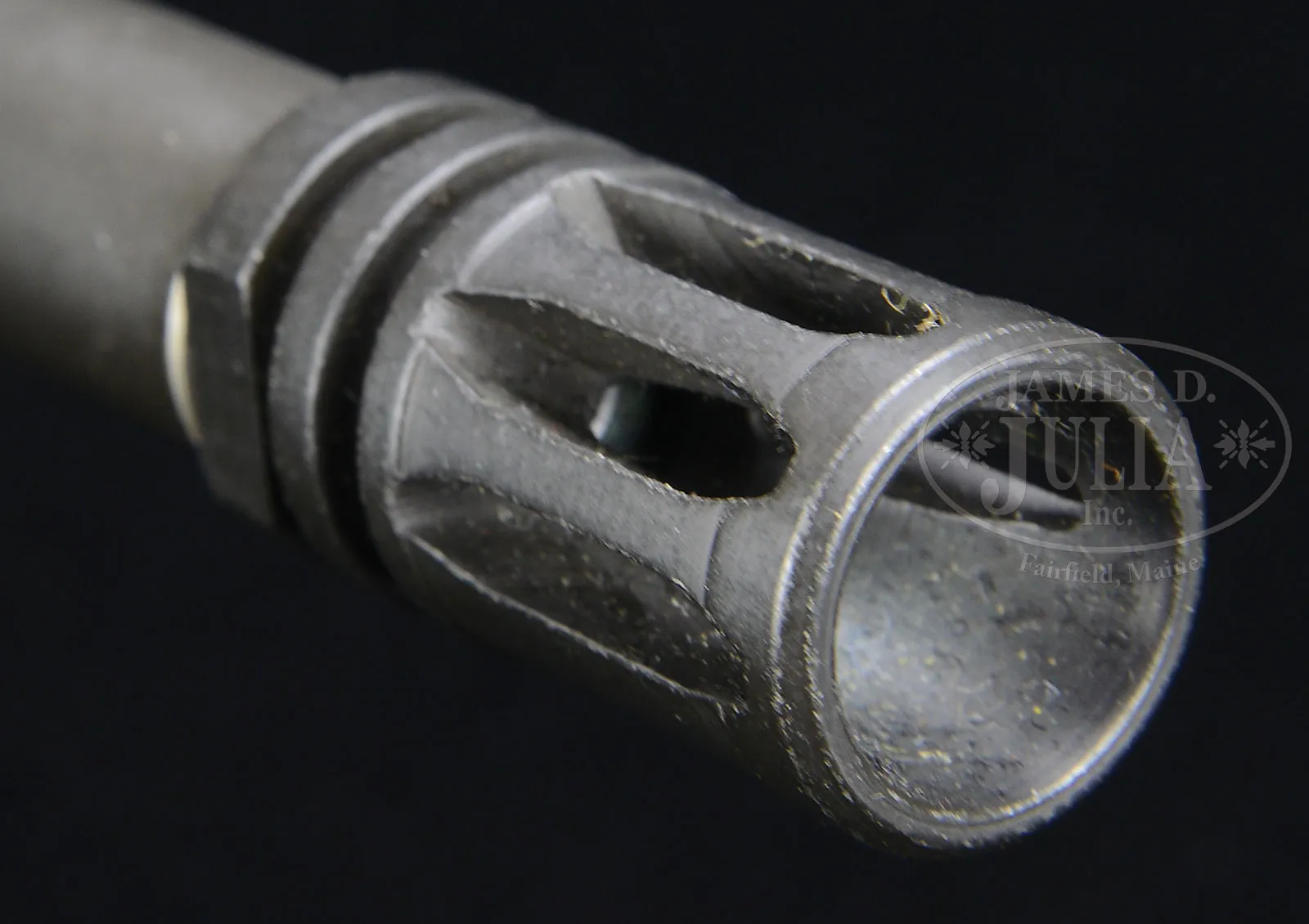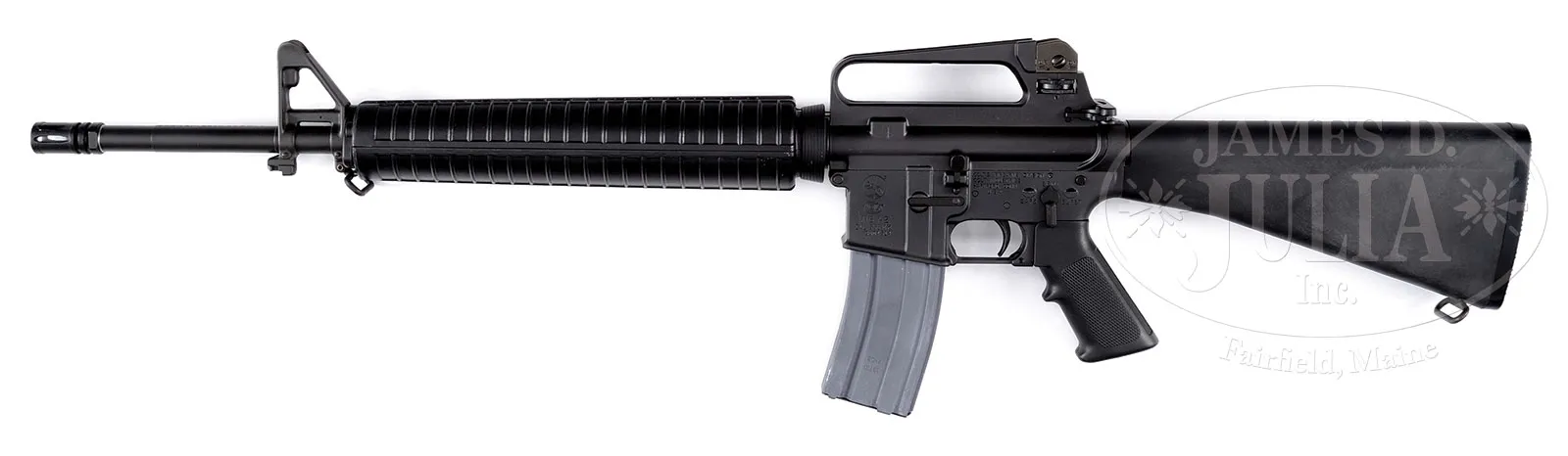 **NEW IN BOX COLT M16A2 MACHINE GUN (FULLY TRANSFERABLE).SN 8004514. Cal. 223. 21″ bbl. Pristine, as new in box Colt M16A2 machine gun complete with forward assist, adjustable rear sight, chrome lined heavy bbl, round hand guards and includes one 30 rnd magazine, cleaning kit, green web sling and orig Colt operators manual as well as orig cardboard shipping box. Selector marked “SAFE”, “SEMI”, and “BURST”, but has full auto internals installed. The M16 platform is current state of the art for American military forces. This model with its rnd hand guards, full stock and marked M16A2 on left side of magazine well is in a configuration very familiar to soldiers and civilians alike. A wonderful piece. This is a National Firearms Act item and requires BATF approval prior to transfer. This weapon is fully transferable on an ATF form 3 or form 4. CONDITION: Overall appearance and finish is extremely fine. New in the box appears to be unfired with magazine and accessories still in orig sealed plastic packet. Impossible to upgrade this specimen of a classic American machine gun. A wonderful opportunity for the machine gun enthusiast as well as a shrewd investor. 53165-9 JWK (20,000-30,000) – Lot 1102