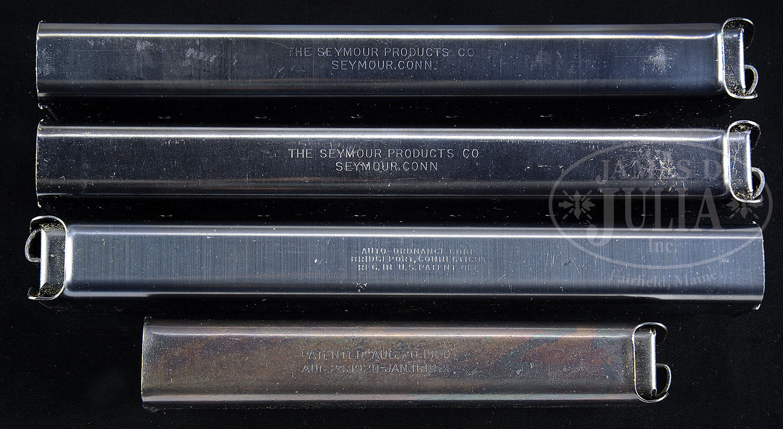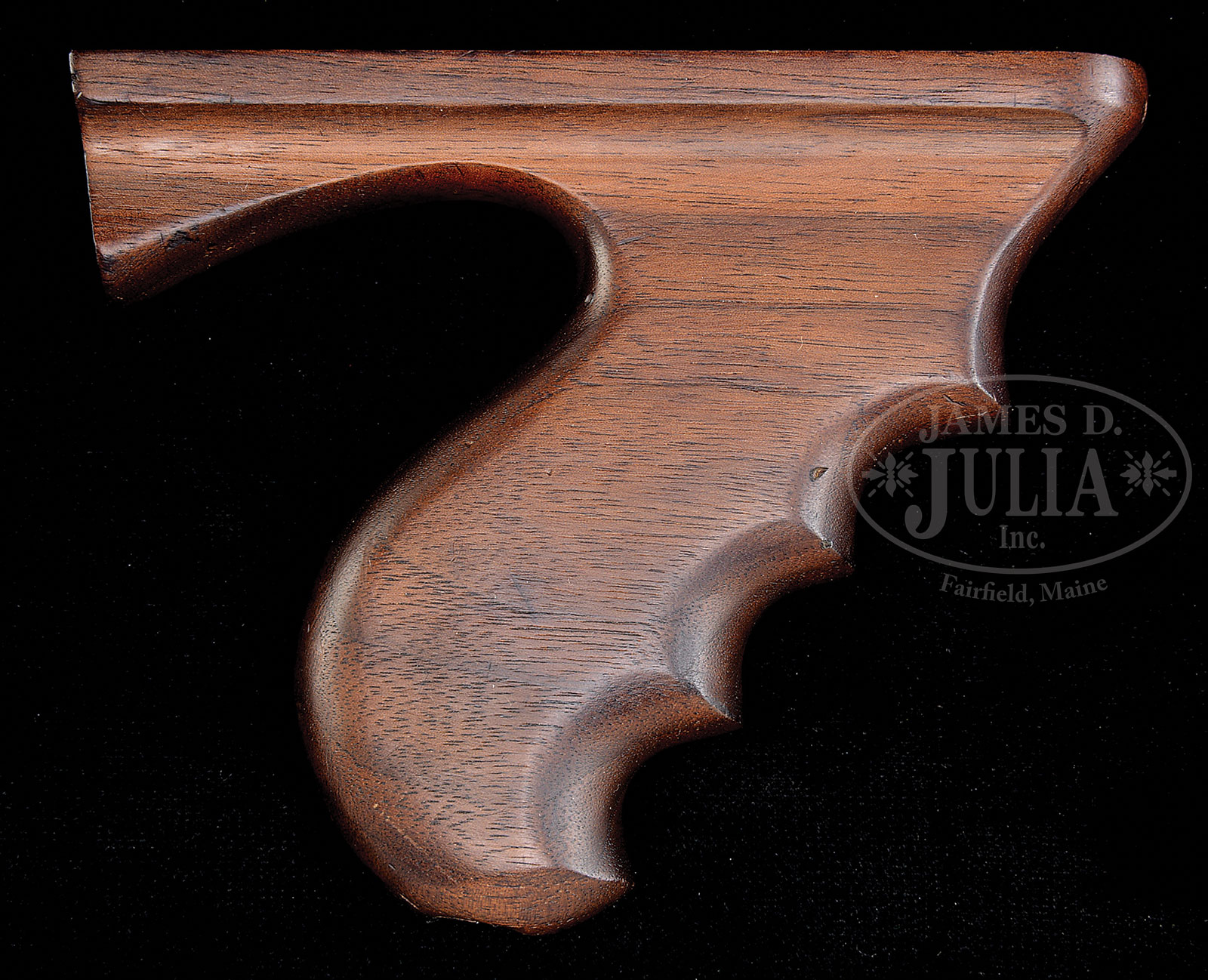 Please Note: Typographical error in the title, the gun is an M1A1 Thompson, which is correct in the description. **HIGH CONDITION AUTO ORDNANCE WEST HURLEY THOMPSON M1 MACHINE GUN (CURIO & RELIC).SN M575A. Cal. 45 ACP. 10-3/4″ bbl. Minty West Hurley M1A1 configured Thompson with fixed rear peep sight, side cocking handle, and non-detachable buttstock. Magazine well not cut to take drum mags and will only accept stick magazines. Includes spare vertical foregrip with retention screw, one leather sling, two 30 round Seymour magazines, one 30 round Bridgeport magazine and one 20 round 1920s patent date magazine as well as a black nylon carrying case. This model of Thompson is the final iteration as produced in great quantity for the US military. It saved considerable time and money in manufacturing over previous models. These guns were made by West Hurley right up until the point when machine guns could no longer be registered for private individual ownership in response to market demand. This is a National Firearms Act item and requires BATF approval prior to transfer. This weapon is fully transferable on an ATF form 3 or form 4 as Curio & Relic eligible. CONDITION: Overall appearance and finish extremely fine. Deep lustrous blue finish with some slight pitting visible on side of bolt as viewed through charging handle slot under a gray patina with slight pin prick oxidation at left hand side of receiver outer most edge which will likely clean up. Wood furnishings are also extremely fine with only the slightest of handling marks. Magazines are in commiserate condition albeit the patent date magazine has been refinished with cold blue touch up giving it a somewhat mottled appearance in strong light. Mechanics are crisp. Bore is extremely fine, shiny, bright, with sharp rifling. An exceedingly attractive Thompson in a difficult to find configuration. 53174-1 JWK (12,000-18,000) C&R – Lot 1080