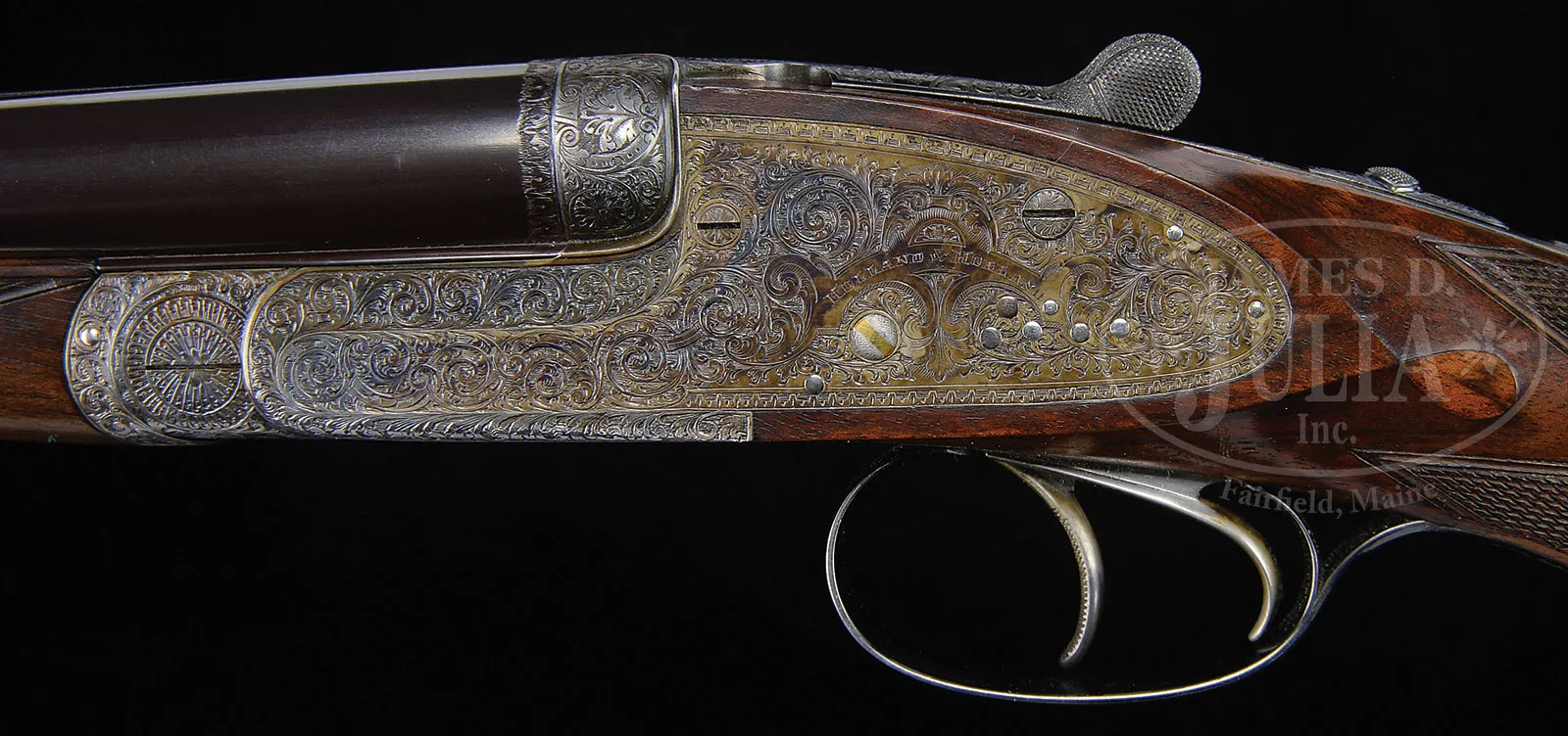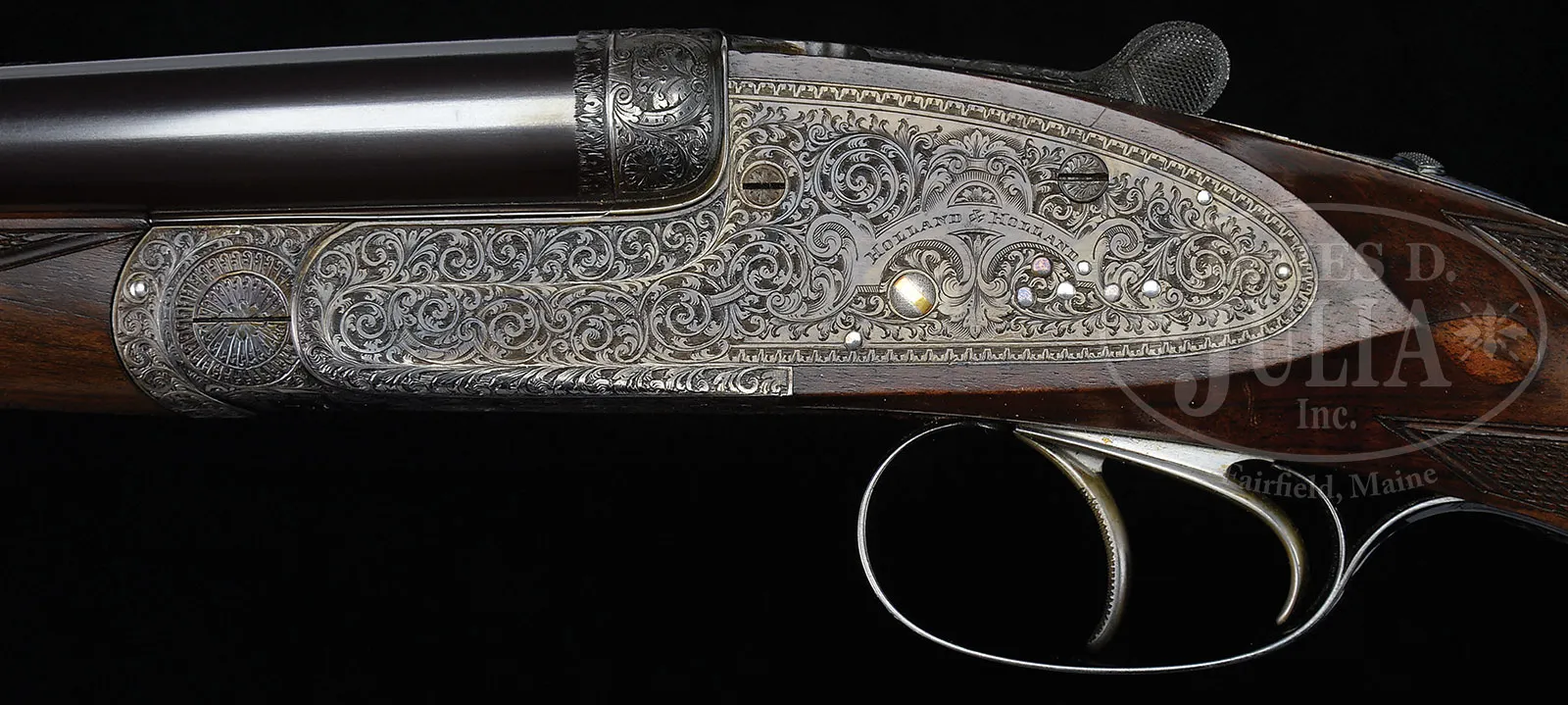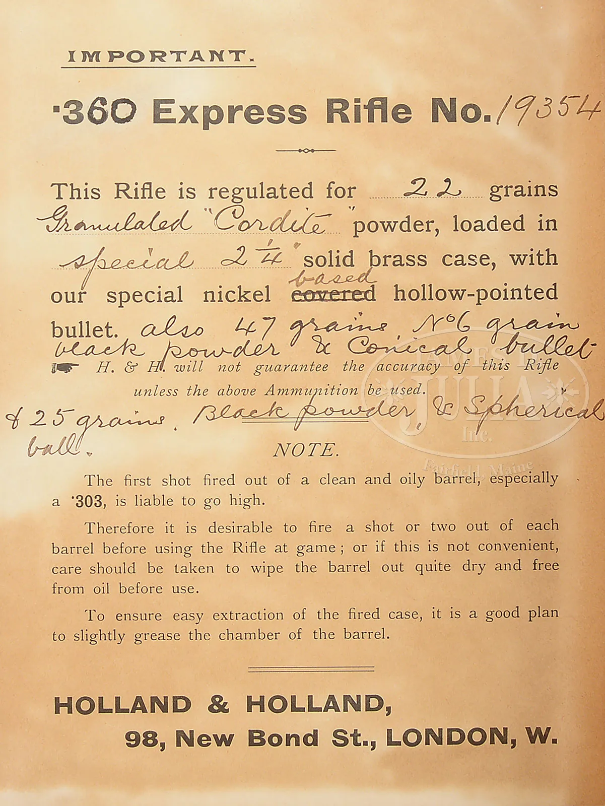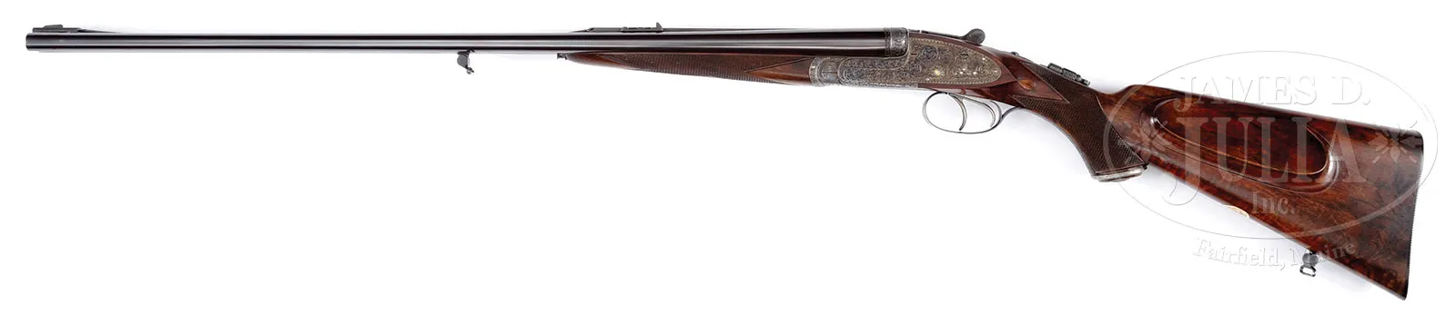 *SUPERB CONDITION SVELTE HOLLAND & HOLLAND “ROYAL” EJECTOR .360 NE DOUBLE RIFLE IN MAKERS CASE WITH ACCESSORIES, MADE FOR NATHANIEL C. NASH, CAMBRIDGE, MASS. IN 1906.SN 19354. Cal. .360 2-1/4″ This superb condition rifle has 26″ chopper lump bbls fitted with file cut H & H style quarter rib with one standing, two folding leaf express sight with ivory triangle inset in standing leaf. Matching front ramp is fitted with enamel bead and flip-up night sight. Tops of bbls are engraved “Holland & Holland. 98. New Bond Street. London.” and “Winners of All the “Field” Rifle Trials, London.” Bbl flats are stamped with London nitro proofs for 30 grains cordite and 300 grain bullet. SNs and Whitworth sheaf of wheat logos are on bottoms of bbls. A sling loop is soldered to bottom rib. Slim, scaled down case hardened action with slightly rounded bar, is fitted with back locks in usual double rifle manner. Top strap extends over comb, and is fitted with folding peep sight which nestles into recess in strap. Action also features automatic safety (SAFE inlaid in gold), hidden third fastener, disc set strikers, gold band tumbler end cocking indicators, and dbl triggers (front checkered). Action and locks are engraved in Holland & Holland house style with full coverage varying sized open shaded scroll with strapwork highlights surrounding “Holland & Holland” in classic H&H arched device on each lockplate. Fences have semi-relief carved acanthus. Bottom of action is engraved “Royal” “Hammerless” “Ejector”. Blued top lever is engraved “Royal Ejector” and trigger guard is engraved with open non-shaded scroll with SN on tang which extends to case hardened trap steel grip cap (spare fore sight in trap). Stump figured and lightly marbled European walnut capped pistol grip buttstock measures 14-3/8″ over orig ribbed horn buttplate. Stock features classic Holland styling, with drop points, point pattern checkering at grip which has reverse curve to rear line, and superbly sculpted right hand shadow line cheekpiece. A sling loop matching that on bbls and a gold oval engraved with monogram “NCN” are on toe line. Matching splinter “AB” ejector forend has Anson release. Drop at heel: approx 3-3/8″, drop at comb: approx 2-7/8″. Cast: approx 1/2 off. Weight: 7 lbs. 11 oz. LOP: 14-3/8″. Orig makers oak and leather case with brass corners and central medallion is lined in scarlet cloth, and has dust divider between lid and bottom compartment. Gold embossed H&H label as well as charge card for this particular rifle, is in lid. Bottom compartment contains an assemblage of orig accessories French-fitted including 3 horn handled turnscrews marked Holland & Holland, and a horn handled striker key, H&H marked round oil bottle, pair of snap caps, pull through cleaning kit in black morocco wallet, lace on leather muzzle protector, carrying sling, broken case extractor, bone striker bottle with spare strikers and ivory front sight, and wood covered steel cleaning rod, with brush in covered compartment which also contains two keys. PROVENANCE: Nathaniel Cushing Nash; Nathaniel Cushing Jr.; The prestigious personal collection of 4-time Oscar-winning Visual Effects Icon, Richard Edlund; Special Gold Medal winner at first CA Side-by-Side Society Concours d’Elegance of Fine Guns in 2000; Copy of factory ledger pages, indicating rifle was finished Nov 1906. CONDITION: It appears this lovely lightweight rifle was another one of Mr. Nash’s favorites, as it shows evidence of light field use, with silvering and thinning of case hardening colors on fences, beads, and on bottom of action and forend iron from normal hand wear, otherwise bbls and stocks have only a few handling and assembly marks. Bores are excellent. Mechanically crisp. Case leather is still light in color, has a few bumps and rubs. Straps and handle are fine. Interior cloth is excellent with compressions and rubs. Labels and accessories are excellent. Perhaps the ideal New England deer rifle, this cartridge in its nitro loading, is equivalent to the 38-55. Special Note: This item(s) contains plant or animal properties that may be covered by the Endangered Species Act (ESA). Please read the Conditions of Sale, section 15, for more information regarding the Endangered Species Act, and your responsibilities as a buyer. 53184-5 MGM (30,000-50,000) C&R; ESA – Lot 1182 Click here to view provenance