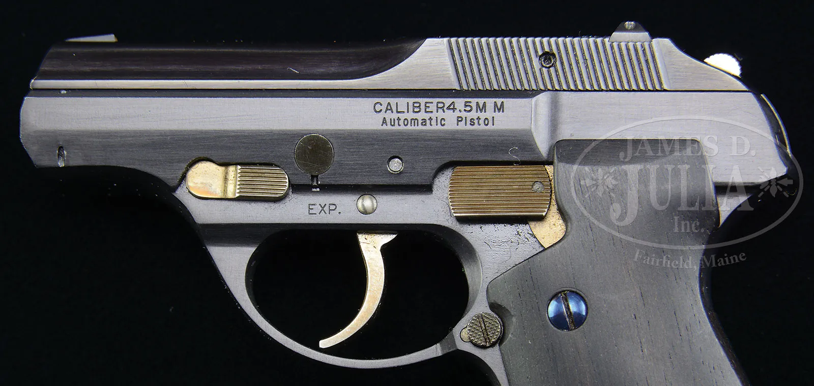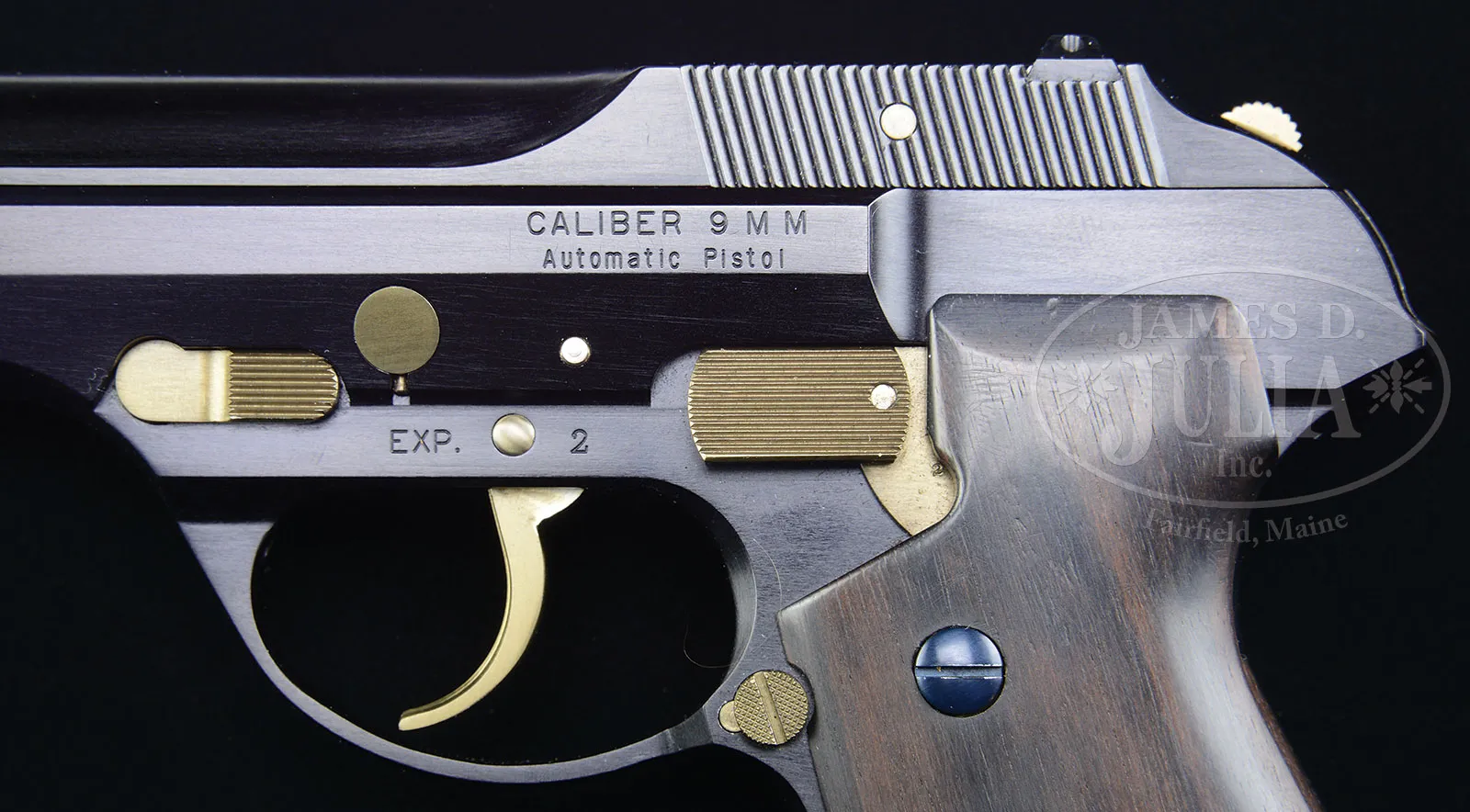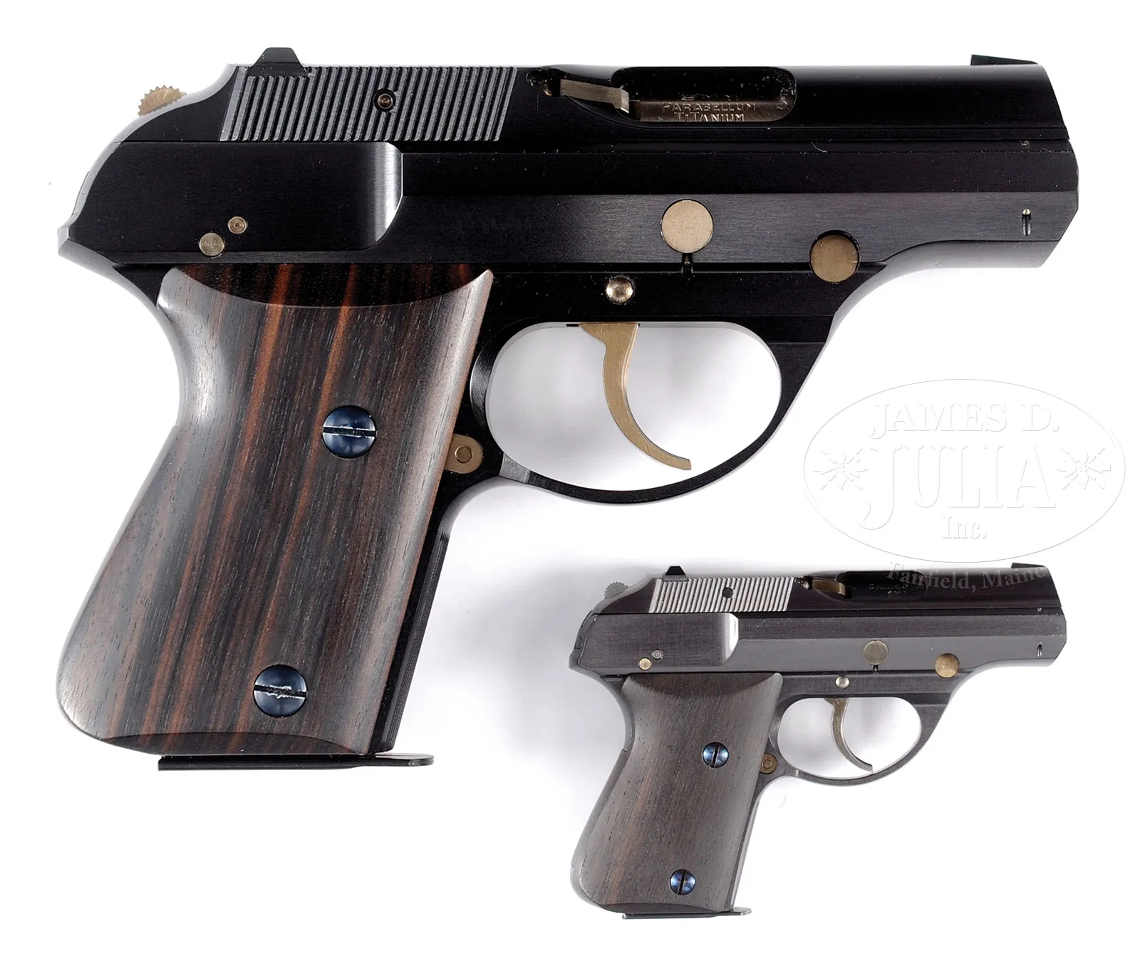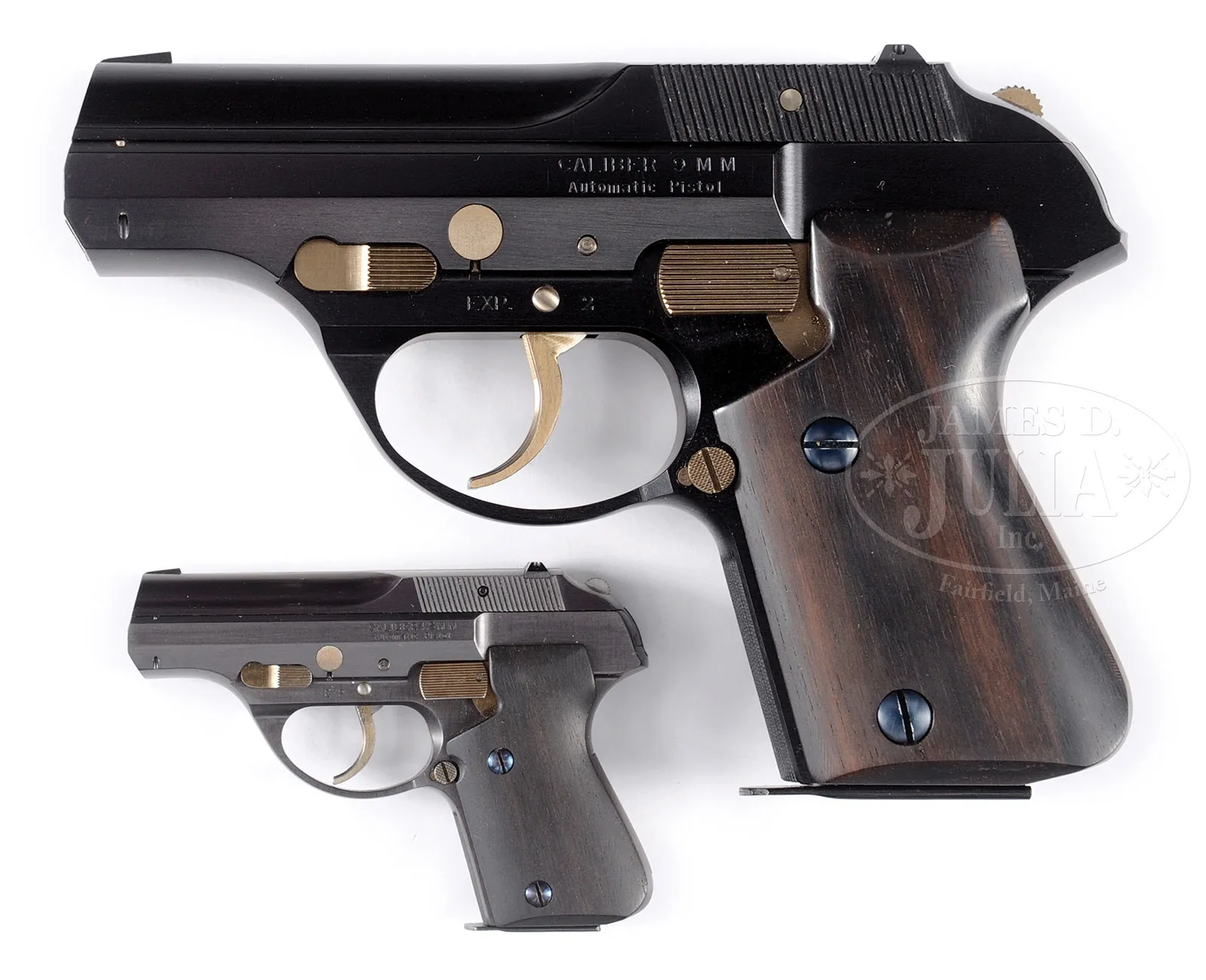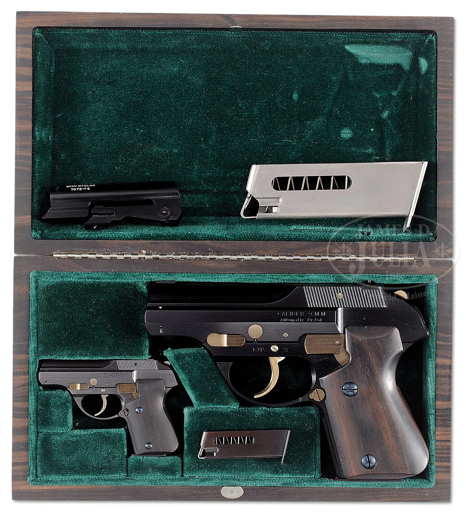 *EXTRAORDINARY CASED SET OF TWO EXPERIMENTAL NORTON DP-75 PISTOLS.1) NORTON DP-75. SN EXP2. Cal. 9 mm 5″ bbl. This exceedingly rare Norton Armament Experimental example is machined entirely from titanium. The left side of the pistol is marked “Caliber 9 MM/Automatic Pistol” and the frame is marked “EXP 2” for Experimental. The pistol has nicely blued frame and slide with straw coloring on small parts. Grips are 2pc smooth rosewood. Accompanied by two 8 rnd single stack magazines, along with an extra Ti barrel assembly. Very little information is available about these lightweight prototypes made in Mt.Clements, MI. Only two such DP-75 Experimentals are known to exist. CONDITION: As new. Pistol retains virtually all of its original finishes. C&R 2) HUTCHENS NORTON. SN EXP. Cal 4.5mm. 2-1/2 Inch round bbl. The left side of the pistol is marked “Caliber 4.5MM/Automatic Pistol” and the frame is marked “EXP” for Experiential. The pistol has nicely blued steel parts with straw coloring on some of the small parts. Grips are 2pc smooth ebony. Functional 4 rnd magazine and one spare mag. This is a 1/2 Scale and fully functional Exact Miniature of the Norton Armament DP-75 engineered by the late Raymond Hutchens, a retired police officer from Indianapolis during the early 1970s. Each one of these pistols took great effort and time to manufacture and produce, having to start by creating a set of miniaturized “SCALE” drawings for each and every part, develop and produced the tooling used in the actual manufacturing. Each part had to be heat treated or hardened and polished with the correct contours to match the original pattern. These exact pistols are illustrated in the book “Scale Modern Firearms” by Kramer on pages 86-88. Housed in a contemporary rosewood case, fitted for the two Norton pistols. CONDITION: As new. Pistol retains all of its original custom finishes. Crisp mechanics. Bright bore. Case is Very Fine, missing nameplate and reinforcing corners. C&R 53190-3, 53190-4 JWD (6,000-8,000) – Lot 1128 Click here to view provenance