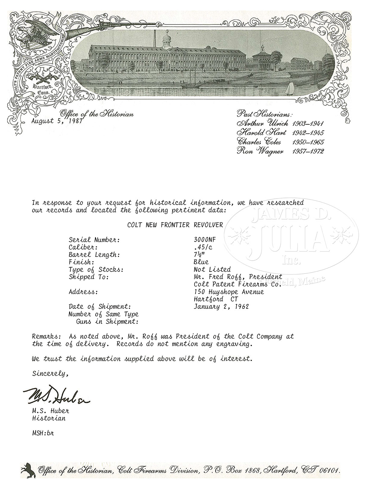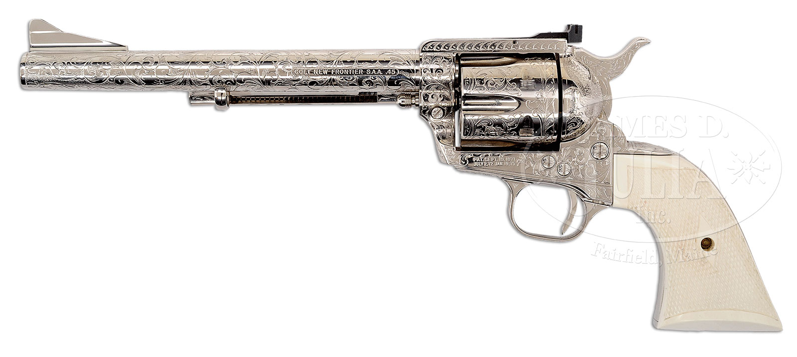 *ELEGANT CASED MASTER ENGRAVED COLT NEW FRONTIER REVOLVER WITH NICKEL FINISH AND FACTORY LETTER.SN 3000NR. Cal. .45 Colt. 7 1/2″ bbl Master engraved Steve Kamyk in scroll and vine motif in the tradition and style of Cuno Helfricht, w/a magnificent flying eagle scene on right recoil shield. The coverage of engraving amounts to what would be considered D coverage. Deep, lustrous nickel finish over the gun’s entirety w/exception of the Eliason target adjustable rear sight. Dual eagles heads are depicted on both sides of the nickel hammer. This cased New Frontier single-action was shipped Jan. 2 of 1962 to Mr. Fred Roff, President of Colt Patent Firearms Co., Hartford, Ct. This was by no doubt a prized custom engraved revolver and probably made for presentation by the President of Colt. Factory letter that accompanies this revolver does not indicate the engraving nor the 2-pc checkered ivory grips. However, the finish and embellishments appear to have been done by the factory. Steve Kamyk was a note Master Engraver for Colt and Engraved a number of firearms specifically for the president of Colt Firearms. These have been recorded in the factory ledgers and observed by us in the past. CONDITION: Extremely fine overall condition w/no indication of use. Bore and cylinder appear to have never been fired, grips fit perfectly and show no signs of distress or material loss. No turn line is evident on cylinder, so to prevent damage mechanics were not tested. Colt monogrammed display glass-fronted display case is equally fine and appears factory new.The revolver itself is signed by Master Engraver Steve Kamyk on the interior of the loading gate. Special Note: This item(s) contains plant or animal properties that may be covered by the Endangered Species Act (ESA). Please read the Conditions of Sale, section 15, for more information regarding the Endangered Species Act, and your responsibilities as a buyer. 53194-1 TDW (10,000-15,000) C&R; ESA – Lot 1420