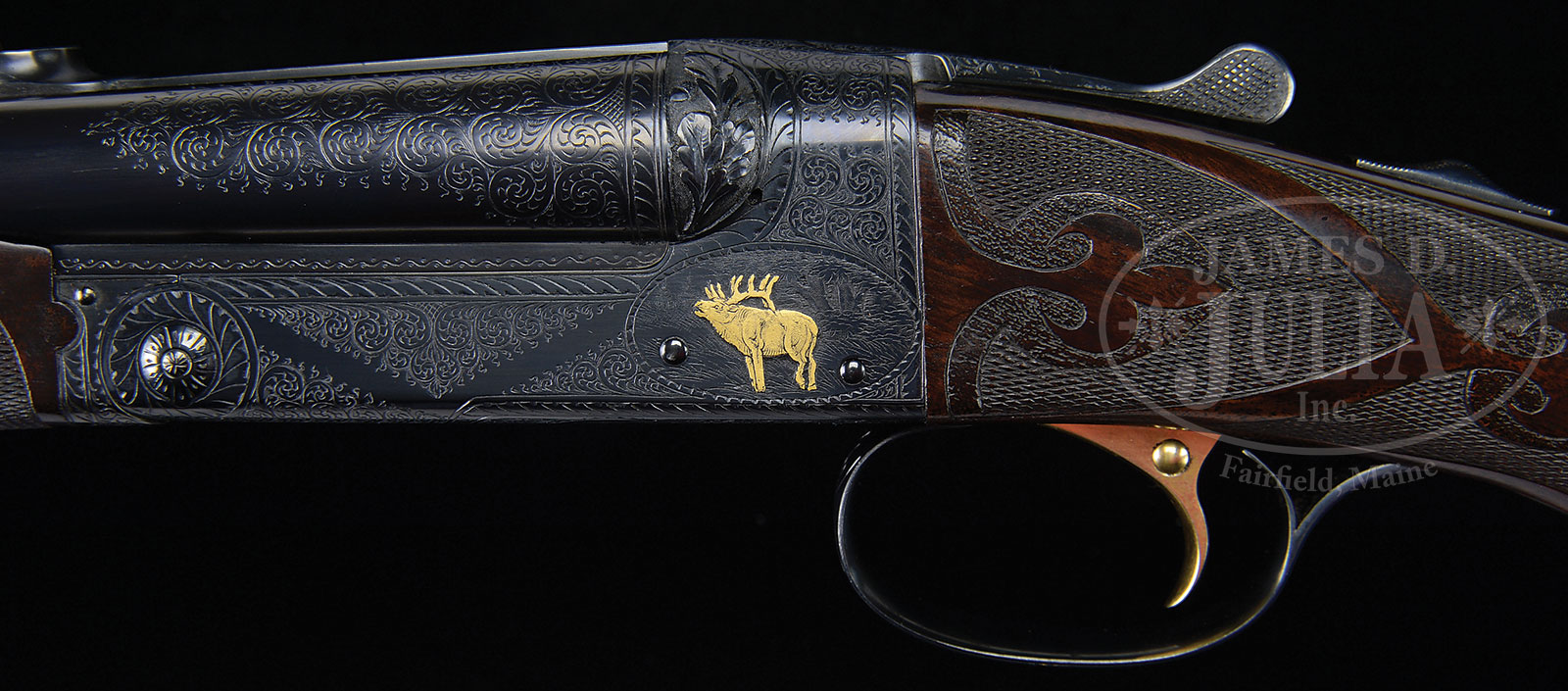 *RARE “EXPERIMENTAL” WINCHESTER MODEL 21 “GRAND AMERICAN” DOUBLE RIFLE IN 9.3 x 72 R WITH CASE AND FACTORY LETTER.SN 33971. Cal. 9.3 x 72R. 26″ Bbls with roll die marking on top left bbl are engraved with caliber. One standing, three folding leaf express rear sight is in island base, and gold bead front sight is in matching front ramp. Breech ends of bbls are engraved with 3″ triangles of scroll. Engine turned bbl flats are stamped with SN, caliber, Winchester proof marks and “EXPERIMENTAL”. Bottoms of bbls are marked “WINCHESTER PROOF STEEL”. Blued flat side action with engine turned water table, is proofed and marked “EXPERIMENTAL”. Sides of action are ported behind fences. Action is fitted with gold plated single selective trigger and automatic safety. Action is engraved in “Grand American” style with 80% coverage scroll surrounding vignettes of game semi-relief inlaid in gold which are barely suitable for this caliber; bugling elk on left side, moose on right, and big horn sheep on trigger plate. The head of a grizzly bear is in gold on trigger guard bow. Fences are relief carved with oak leaves and acorns. XXX crotch figured American walnut engraved steel capped pistol grip buttstock measures 14-5/8″ over red Winchester pad. Side panels and grip are B-carved, with numerous fleur-di-lis intrusions and flourishes into butt. Matching beavertail ejector forend has inset contrasting wood tip, reinforcing brace, and engine turned internals. Drop at heel: approx 2-7/16″, drop at comb: approx 1-5/8″. Weight: 9 lbs. 5 oz. LOP: 14-5/8″. Oak and leather case with brass corners has gold canvas trimmed outer cover. Case is lined in burgundy cloth and has gold embossed black leather Model 21 label in lid. Case contains square oil bottle, snap caps, and wrapping paper. PROVENANCE: Factory letter. CONDITION: Excellent, essentially as new, with only the faintest of handling and assembly marks in all wood and metal surfaces. Mechanically crisp. Case is excellent. 53197-11 MGM (20,000-30,000) – Lot 1283