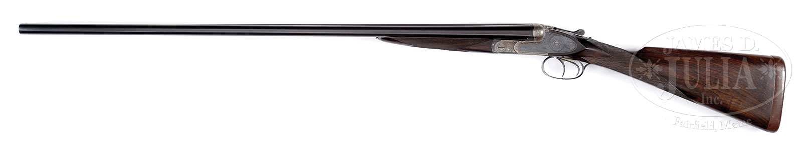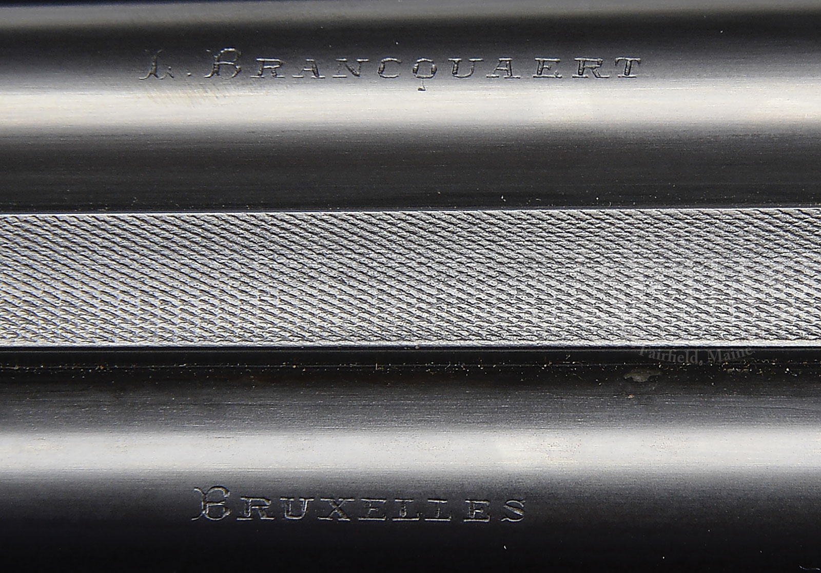 *EXQUISITE QUALITY HIGH CONDITION 32″ BARRELED 20 GAUGE EJECTOR GAME SHOTGUN BY L. BRANCQUAERT OF BRUSSELS WITH EXTRA 28″ BARRELS AND LO’M CASE.SN 7415. (on action) (pre 1922) Cal. 20 ga. 2-3/4″ Chambers. Although not a household name, guns made by Brancquaert attained fame in the late 19th and early 20th century in the pigeon ring, and are known today as some of the finest ever made by those who appreciate good shotguns. This unusual small gauge example has 32″ and 28″ chopper lump bbls, both with slightly raised matted concave game ribs with ivory beads, and are engraved “L. Brancquaert” and “Bruxelles” on tops. Bbl flats of 32″ bbls are stamped with Belgian nitro proofs without date letter, and are stamped with choke information, SNs, and cockerel steel logos, and are engraved “COMPRESSED STEEL”. 28″ Bbl flats are stamped with 1988 London nitro proofs for 2-3/4″ chambers, and engraved with SN. Case hardened sideplated boxlock action features non-automatic safety (S inlaid in gold), hidden third fastener, side clips, reinforced frame and dbl triggers (front articulated). Action is engraved with near full coverage very nicely cut rose and scroll within geometric borders. Sideplates, floorplate, top lever, and trigger guard are charcoal blued and also engraved with small scroll and large whorls of roses, etc around pins. Nicely streaked and lightly figured very dense dark European walnut straight grip buttstock measures 14-3/8″ over brown leather covered pad. Point pattern checkering on diamond grip is exceptionally well done, cleanly cut, and with small uncheckered diamonds left at inner points on sides, at top of grip, and at apex on toe line. Matching splinter ejector forend with Anson release has wonderfully finished checkering, matching buttstock. 32″ BBLS: Bore diameter: left -.630, right – .627. Bore restrictions: left – .038 (extra full), right – .020 (mod). Wall thickness: left – .033, right – .031. Drop at heel: 2-1/16″, drop at comb: 1-7/16″. Cast: approx 1/4 off. Weight: 7 lbs. 2 oz. LOP: 14-3/8″. 28″ BBLS: Bore diameter: left -.622, right – .622. Bore restrictions: left – .019 (mod), right – .012 (lt mod). Wall thickness: left – .039, right – .038. Drop at heel: 2-1/8″, drop at comb: 1-1/2″-. Cast: approx 1/4 off. Weight: 6 lbs. 11 oz. LOP: 14-3/8″. Gun is accompanied by its orig leg o’ mutton case with space for both sets of bbls. CONDITION: Excellent. Bbls retain nearly all of what appears to be their orig blue, but is possibly a re-blue done with very little polishing. Action retains 50 – 60% orig muted case hardening color, strong where protected. Sideplates, floorplate, and top lever retain 80 – 90% of their orig bright blue with some light marks and a few scratches on floorplate. Trigger guard retains more than half of its orig blue. Stocks retain essentially all of their orig hand rubbed oil finish which is a bit dry, have not seen any added oil. Checkering is still clean, and very lightly worn. Bores are excellent. Action has just a hint of looseness with 32″ bbls, and is a touch off face. 28″ Bbls are tight and on face. Ejectors are in time. Case is good with some scuffs, top strap re-stitched, other straps and hinges intact. Special Note: This item(s) contains plant or animal properties that may be covered by the Endangered Species Act (ESA). Please read the Conditions of Sale, section 15, for more information regarding the Endangered Species Act, and your responsibilities as a buyer. 53198-2 MGM (7,000-10,000) C&R; ESA – Lot 1264