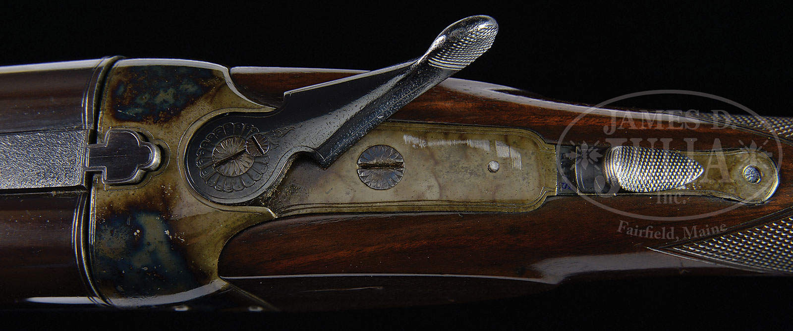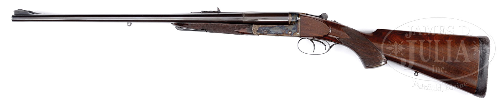 *PERFECT FOR YOUR NEXT SAFARI, A GREAT RIFLE FOR A PROFESSIONAL HUNTER, ARMY & NAVY BOXLOCK EJECTOR DANGEROUS GAME DOUBLE RIFLE WITH CASE.SN 55031. Cal. .458 Winchester Magnum. 23″ Chopper lump bbls are fitted with quarter rib, mounted with one standing, two folding leaf express rear sight, and matching front ramp base with silver bead with flip-up gold night bead. Bbl flats are stamped with 1973 London nitro proofs for .458 magnum. Bottoms of bbls are stamped with nitro proof and “SLEEVED”. Tops of bbls are engraved “Caliber 458″ Win. Magnum.” and “Regulated For 500 Grain Solid Bullet”. Extractors have been fitted with camming blades to engage rimless cartridge in Westley Richards style, which has been time tested for related rimless cartridges like the .425. Case hardened, robust, PHV-1 boxlock action features automatic safety (SAFE silver inlaid on dovetailed rectangular piece), pivoting third fastener engaging square shouldered dolls head rib extension, bushed strikers, and double triggers. Action has only line border engraving with a few flourishes of scroll either side of engraved screw heads. “Army & Navy C.S.L.” is engraved on each side. Top lever, floorplate, and trigger guard are blued. Trigger guard bow has scroll engraving. SN is on tang, which extends to large composition grip cap. Relatively plain, but dense, European walnut capped pistol grip buttstock measures 15″ over black leather covered pad. Point pattern checkering with mullered borders is at grip, and a wide sling loop is on toe line. Matching splinter ejector forend has forward pivoting release. Drop at heel: approx 2-5/8″, drop at comb: approx 1-13/16″. Weight: 11 lbs 0 oz. LOP: 15″. Makers brown canvas covered case with leather trim, is lined in green cloth, with Army and Navy Gun Department gold embossed leather label in lid. Case contains straps, and a square tin oil bottle. Also included are two targets, marked “original target when new barrels were regulated”, one marked “two shot group, five yards”, with two shots almost touching near center of bull, and another marked “four shot group, fifty yards” with three holes, less than 1″ apart at center of bull, one hole slightly elongated. CONDITION: Excellent, as refurbished, retaining most finishes applied when bbls were sleeved in London, with some handling marks on metal and wood. Pad has numerous scuffs. Bores are excellent, bright, sharp, and shiny throughout. Action is tight. Bbls are on face. Ejectors are in time. Case canvas has some minor scuffs. Interior cloth is very fine with marks and rubs. Label has some rubs through and cracks. This well balanced rifle in a caliber easily found throughout the safari areas of Africa, would undoubtedly make a good working rifle. 53198-4 MGM (8,000-10,000) C&R – Lot 1174