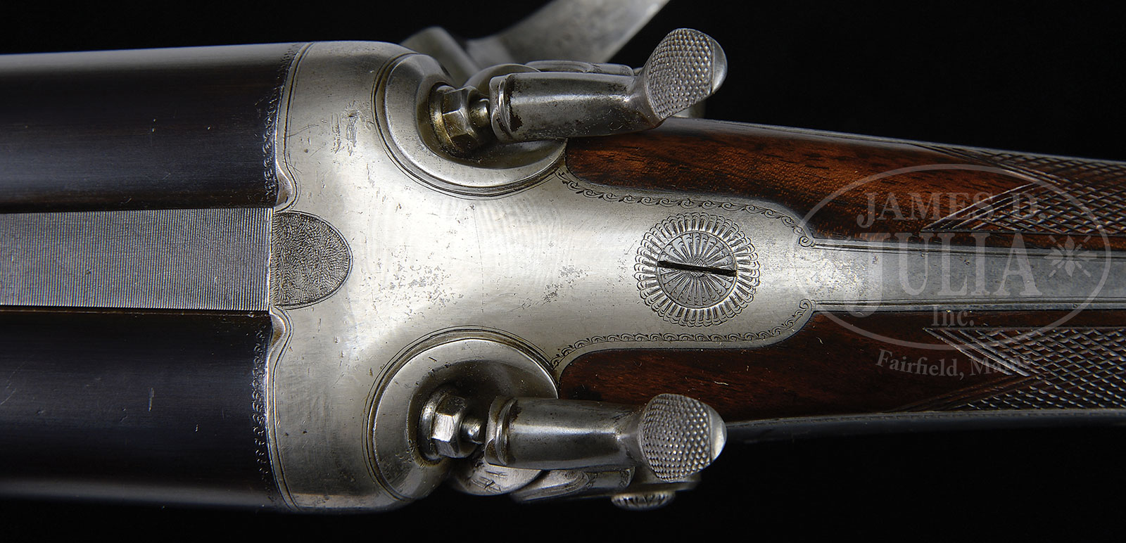 SN 15300. (ca 1893) Cal. 8 bore. All “Paradox” guns are rare, and have become very desirable, but 8 bores are by far the rarest with only 69 being produced by the maker. The “Paradox” produced near double rifle accuracy with its specially designed bullet given its final spin by a rifled choke, but also allowing a fairly decent pattern while using shot. This large example regulated for 273 grains (10 drams) of powder could be used for the largest pachyderms on the planet. It has 26-1/4″ steel bbls fitted with matted, quarter rib holding single standing leaf express sight. Sunken mid rib rises to form front ramp holding silver bead with flip-up night bead. Tops of bbls are engraved “Holland & Holland 98 New Bond Street London.” and “”PARADOX”” “Fosbery Patent”. Bbl flats are stamped with London black powder proofs for 273 grains of powder. Heavy solid splinter is stamped with SN. Manufacturers number “H2672” is on bottom of right bbl. A wide sling loop is soldered to bottom rib. Heavy round bodied Jones underlever action with top tang that extends over sloped comb, is fitted with peninsula back locks mounted with relatively short flat faced serpentine hammers with tall spurs. Action and locks are engraved with line and small scroll borders. “Holland & Holland” is on each lockplate. Left side of action is engraved “Charge 8 to 10 Drams Case 3-1/2 Inches”. Very finely marbled dense European walnut horn capped pistol grip buttstock measures 14-1/2″ over old, possibly orig, leather faced Silver pad. Flat top point pattern checkering is at grip, and right side has well carved shadow line cheekpiece. A vacant silver oval and sling loop, are on toe line which is also stamped with Kenya registration numbers. Matching splinter forend has front pivoting lever release. Drop at heel: approx 2-3/4″, drop at comb: approx 2″. Weight: 15 lbs. 5 oz. LOP: 14-1/2″. Gun is housed in old oak and leather two tier case with brass corners and circular central medallion. Interior is lined in blue cloth, and has old H&H label in lid. Lift-out top tray contains loading and cleaning tools including 3-pc heavy ebony and brass cleaning rod with mop, brush, and jag, 8 bore chamber brush by Dixon, H&H marked round oil bottle, bone striker bottle, and two Hawksley marked horn handled turnscrews. Re-loading equipment includes large brass mold marked “Holland & Holland London 8 B Paradox” casting the correct type and size bullet for this gun. Mold is stamped with initials “JRM”. Other tools include H&H marked fixer, 10 dram powder measure, Paradox regulator, unmarked brass and ebony wad funnel and rammer, as well as a JRM marked capper/ decapper with removable ebony handle. Gun is housed in bottom section which contains 9 heavy turned brass 8 bore cases, head stamped “H & H Paradox”, along with some bullets and wads. CONDITION: Good, as partially refinished. Bbls retain nearly all of a satin rust blue over numerous light marks. Action cleaned to silver gray with traces of silvered case hardening visible. Stocks refinished and retain essentially all of that finish with some light scratches and marks. Checkering nicely re-cut. Bores are very fine to excellent, lightly frosted at breech ends. Action is tight. Bbls are on face. Locks are very fine. Case leather is considerably darkened with numerous scuffs and rubs. Straps and handle are intact, but quite tender. Renewed interior cloth is excellent. Conserved label is lightly foxed with a rub through. Mold, regulator, and capper/ decapper are nicely aged. Other accessories are fine. 53202-1 MGM (30,000-50,000) – Lot 1176