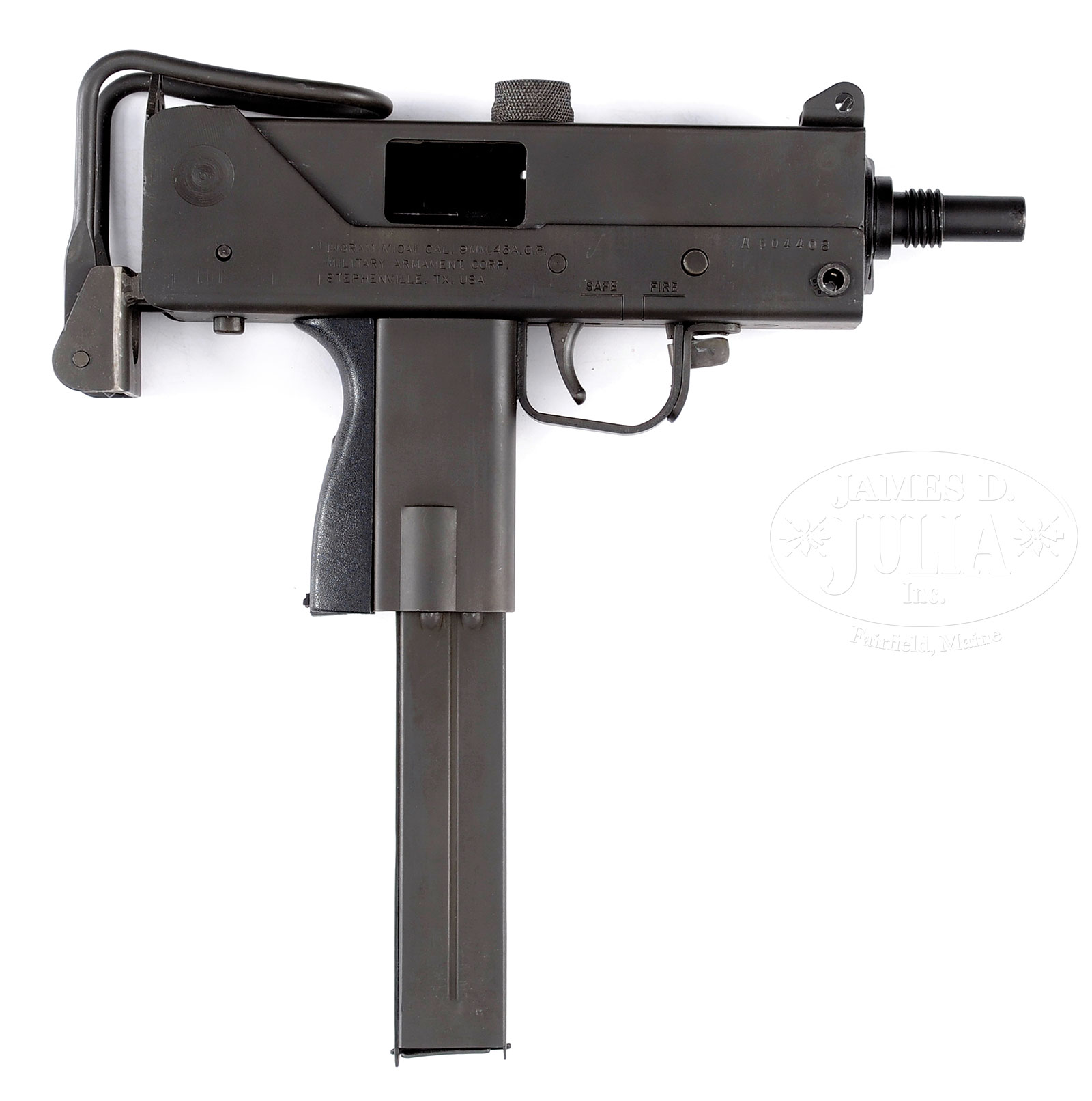 **RARE TEXAS MANUFACTURED INGRAM M10A1 MILITARY ARMAMENT CORP MACHINE GUN (FULLY TRANSFERABLE).SN A604408. Cal. 9mm. 6″ bbl. Extremely fine condition MAC INGRAM M10A1 registered in both 9mm and 45 ACP with Stephenville, Texas address on right side of frame. Safety is a “Push through the trigger guard” type reminiscent of the M1 Garand rifle. Heavy duty knurled cocking knob at top of receiver with recess to be able to view front sight. Telescoping buttstock at rear of receiver. Selector on left side indicates “1” and “32”. Included is one high capacity magazine and cardboard shipping box. This is a very well made and hefty specimen, well suited for either 45 ACP or 9mm but currently in 9mm. Recessed circular cut-out on right side of frame as factory finished. This is a National Firearms Act item and requires BATF approval prior to transfer. This weapon is fully transferable on an ATF form 3 or form 4. CONDITION: Overall appearance and finish extremely fine, smooth gray orig finish on all metal parts to include magazine. Mechanics are crisp, bore is very fine and brilliant with some firing residue. A very nice specimen from a rare manufacturer. This should be of interest to forward thinking collectors as these popular machine gun models are enjoying a rise in popularity. 53237-2 JWK (5,500-7,500) – Lot 1044