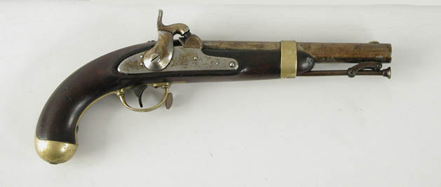 JOHNSON MODEL 1842 MARTIAL PISTOL. CAL. 54. 8-1/2” round bbl, lock plate date “1854”. NSN CONDITION: Iron parts have light to moderate pitting. The brass shows previous polishing and some dents around the butt cap. The stock is cracked twice at the rear of the lock plate, once at the front and once at the rear lock screw. The wood has been gouged out around the rear of the lock plate. The inspector cartouches are visible but not completely readable. The bore is lightly pitted, lock is fine. 4-45049 FS69 (600-800)