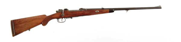 *DELUXE ENGRAVED GERMAN SPORTING RIFLE. Cal. 8×57. Beautiful engraved rifle with 23″ oct. to round bbl, full matted rib, ramp front sight, 2-leaf express sight, cased colored engraved receiver with claw mount bases and dbl. set triggers. The floorplate and trigger guard are also case colored with matching floral and vine engraving with game scenes of stag and raebuck. The 1-pc stock has a black foreend tip, checkered forearm and round pistol grip with cheek piece and brown waffle pad. The bbl is secured with a single wedge through German silver escutcheons. SN 40678. CONDITION: Excellent. Bbl retains 95-97% original blue, the receiver 40-50% case colors, bright in sheltered areas. Trigger guard and floorplate are mostly a dark gray. The nicely figured wood retains most of a recent refinish. Bright shiny bore. 4-46567 JR61 (1,000-1,500)