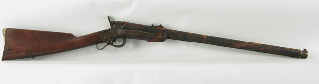 SHARPS & HANKINS CARBINE. CAL. .54. 24” bbl. Missing safety, rear sight slide and sling swivel. The lever catch is broken, the rear sight is bent, the leather covering on the bbl is unstitched and missing one ear at the rear. The numbers do not match. SN 5196. CONDITION: Rust-brown patina overall with some spots, light to heavy pitting. The leather cover is badly chipped and missing small pieces. The stock is cracked length-wise but is otherwise good. The bore is poor, action is good. 4-45078 FS9 (700-1,100)