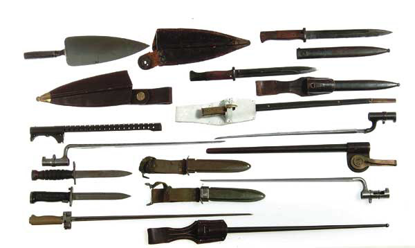 LOT OF 9 BAYONETS, HANDGUARD AND SPARE SHEATH. 1) Trapdoor Springfield Trowel bayonet with brass tipped sheath, missing the hanger. Bayonet excellent. 2) US marked socket bayonet for Springfield percussion musket – Very good. 3) US socket bayonet for trapdoor rifle with metal sheath, leather frog and brass hanger – Sheath excellent, blade excellent, socket cracked. 4) Enfield socket bayonet with brass and leather sheath and white leather frog – Very good. 5) French Chassepot bayonet with metal sheath and frog – Very good. 6) German short bayonet, WKC with matching metal sheath and frog – Good, chipped handle. 7) German bayonet with metal sheath, mis-matched – missing frog – About good. 8) US Imperial M-5 bayonet with 1st-type M-8 sheath – Good. 9) US Imperial M-4 bayonet with 2nd-type with 1st-type M-8 sheath – Fair. 10) Reproduction brown leather Trowel bayonet sheath – Excellent. 11) Military trench gun pierced metal handguard with bayonet lug – missing parts – Very good. 4-47116 JR324 (500-1,000)