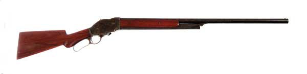 WINCHESTER MODEL 1887 LEVER ACTION SHOTGUN. Cal. 12ga. Standard grade shotgun with 30″ plain bbl. Uncheckered wood, semi-pistol grip stock and checkered steel buttplate. Receiver is case colored and wood is moderately figured. SN 4467. CONDITION: Excellent. Bbl and magazine tube retain 92-93% strong original blue. Receiver about 90% case colors, brilliant on the left side, slightly darker on the right. Top tang and lever are mostly gray with traces of brilliant case colors in sheltered areas. Wood is sound and retains about 95% strong bright original varnish with a gouge on the left side of the forearm. Good bore with moderate pitting. 4-46796 JR1 (2,500-4,000)