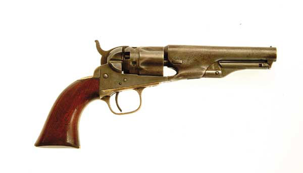 COLT MODEL 1862 POLICE REVOLVER. SN 8175, matching including wedge. Cal. .36, 4-1/2″ round bbl. CONDITION: Traces of blue and case hardening, mostly smooth gray patina. Traces of silver on backstrap and trigger guard. 1-line New York address on top of bbl. Grips have small cracks at the top and are worn flat on the high spots but retain about 85% of the varnish. Wedge screw is a replacement. Action is tight. 4-46393 FS97 (800-1,200)