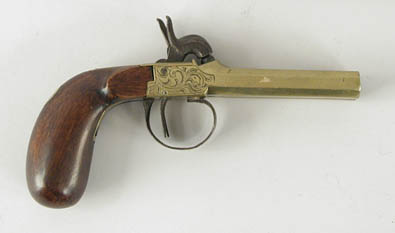 BELGIAN DOUBLE BARREL BOXLOCK PISTOL. CAL. 38. 3-1/2” oct. bbls. The right hammer face has been plugged and both nipples are broken. NSN CONDITION: The 1-pc brass frame and bbls have been polished but are beginning to tone. The iron parts have moderate to heavy pitting. The wood has been sanded and refinished. Bores are poor, action is functional. 4-44741 X31 (100-200)