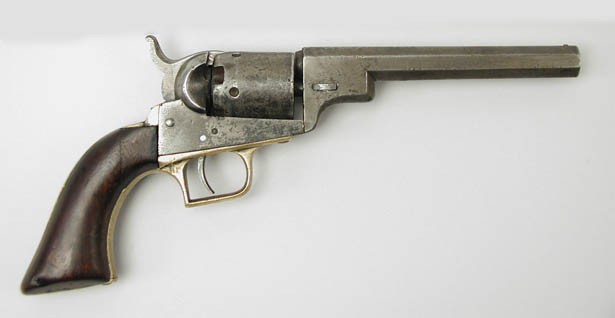 VERY EARLY COLT BABY DRAGOON REVOLVER WITH CONFEDERATE CONNECTIONS. CAL. 31, standard Baby Dragoon with 5″ oct. bbl without rammer. Cylinder has round stop holes and has brass grip frame with 1-pc wood grips. Top flat of bbl is devoid of the orig. Colt markings but there is very faintly visible the word “Orleans”, presumably the stamp of a New Orleans retailer. Accompanied by a hand written letter dated 8/2/01 by Paul Harwell stating that this revolver was owned and used by Confederate Col. Henry C. Kellogg, who was the great uncle of Harwell and also was the clerk of the Dahlonega Mint in Georgia in 1861. Apparently after the Confederacy seized the mint, Kellogg joined the Confederate Army as Captain and by the end of the war had become a Brevet Brigadier General and allegedly carried this revolver throughout the war. SN 182 CONDITION: All matching, except the wedge which is a modern replacement. No orig. finish remains, no marking remains on bbl and no scene remains on the cylinder. Iron parts are a medium gray-brown patina with nicks and dings on cylinder, several replaced screws. Repaired and refinished grip and solder repairs on the back strap where it meets the frame. 4-45263 Z150 (3,750-4,750)