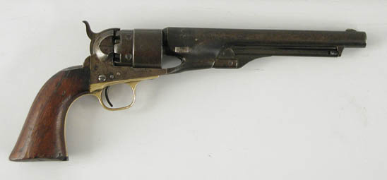 COLT 1860 ARMY REVOLVER. CAL. 44. 8” round bbl, 4-screw variety cut for shoulder stock. SN 22236, all matching except wedge. CONDITION: Brown patina overall with light to moderate surface rust on back strap, light elsewhere. The wedge has been jammed in backwards. Grips have minor chips at the toes and considerable battering at the bottom but still retain much of the varnish. Cartouche is faintly visible on the left side, bore is very dark, action is good. 4-44758 FS28 (500-800)