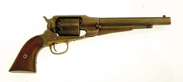 REMINGTON NEW MODEL ARMY REVOLVER. SN 55421. Cal. .44, 8″ oct. bbl. CONDITION: Metal surfaces have been cleaned and chemically treated. Grips have no finish and they are worn and chipped around the bottom. Action needs slight adjustment. 4-46396 FS187 (400-500)