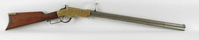 RARE U.S. INSPECTED HENRY RIFLE. CAL. .44. 24-1/4” oct. bbl, follower, spring and rear sights are replacements. The upper tang is cracked and the tang screws are replacements, top rear is stripped. The buttplate screws have matching numbers. “C.G.C” inspector mark on bbl is faint. “H” marks on frame and bbl are sharp. SN 3537 CONDITION: Metal surfaces were cleaned and polished long ago and have now turned to a mellow patina on the brass and gray patina with scattered pitting on the iron parts. The stock has been sanded and refinished. The bore is poor, action is good. 4-44781 FS6 (15,000-25,000)