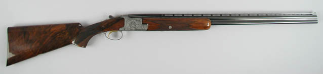 *BROWNING DIANA GRADE OVER UNDER SHOTGUN. CAL. 410. Beautiful and scarce Belgian made Diana grade shotgun with 28″ vent ribbed bbls., choked, SKEET/SKEET with double ivory beads. The receiver is beautifully engraved with pheasants on the left side, ducks on the right side, quail on the floor plate and rabbits on the trigger bow surrounded by full coverage leaf and vine Arabesque patterns. Both side panels are artist signed “CH. SERVAIS”. The receiver, trigger guard and foreend iron is finished in French gray. The buttstock is highly figured burled French or Circassian walnut with fine checkering. The stock is square knobbed 14 1/4″ over the orig. black Browning buttplate. It is fitted with single selective gold trigger and ejectors. SN 1919J7 CONDITION: As new, retains virtually all its orig. finish to both metal and wood, appears to be unfired. 4-45468 JL284 (7,500-12,500)