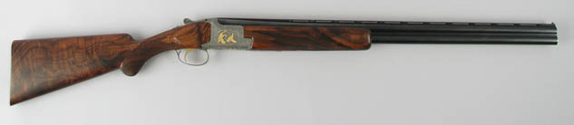 *BROWNING AMERICAN MALLARD COMMEMORATIVE OVER UNDER SHOTGUN. CAL. 12ga. Spectacular Belgian made engraved superposed Browning with 28″ vent rib barrels. choked FULL/MOD with double ivory beads. The very highly figured oil finished wood is finely checkered with long tang and round knob stock, 14 3/8″ over a checkered butt. It is fitted with single selective gold trigger and ejectors. The receiver and trigger guard, in French gray, are spectacularly engraved in the style reminiscent of Angelo Bee with full coverage Arabesque patterns and game scenes of Mallard ducks in high relief gold in great detail in gold ovals on both sides. Each panel has two full bodied Mallards in flight with two more high relief flying Mallards on the bottom. The trigger guard has a high relief Mallard head on the bow. The bottom of the receiver is also inlaid in gold in a riband “AMERICAN MALLARD ANAS PLATYAHYNCHOS” and “062 OF 500”. Accompanied by its orig. red velvet lined walnut presentation case with full-length piano hinge and three latches with leather carrying handle. Ser. 8G4PM00062. CONDITION: Spectacular, as new, unfired, retaining virtually all its orig. finish to both metal and wood. The case is equally new. 4-45469 JL283 (4,500-9,000)