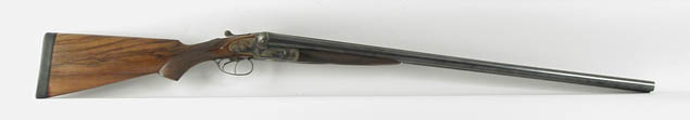 *FRANCOTTE MODEL 45 EAGLE GRADE DOUBLE BARREL SHOTGUN. CAL. 12ga. Post-war manufacture with 30″ bbls, choked FULL/FULL, raised matted rib with rib extension and Greener cross bolt. The bbls are marked “Von Lengerke & Detmold US Agents, New York”. Receiver and sideplate are case colored and game scene engraved with pheasants and partridge on the left side, wood cock and ducks on the right side. The bottom of the receiver has a gold spread-winged American eagle inlay and there is a heron engraved on the trigger bow. The areas surrounding the game scenes on the sideplates and receiver, are completely covered with very fine arabesque pattern engraving. The fences are deep relief engraved in leaf patterns. The foreend iron is engraved in matching arabesque patterns. The wood is moderately figured European walnut with splinter forearm and semi-pistol grip stock, 15″ over a Pachmayr Old English pad. This fine shotgun is also fitted with ejectors and dbl. triggers. SN 84277. CONDITION: About excellent. Retains most of a fine professional restored finish with a chip missing from the forearm tip and two or three small chips missing from the grip edge with an oil stain on the toe. Small dent and light scrape on the left bbl. Brilliant shiny bores. 4-43347 Z503 (3,500-7,000)