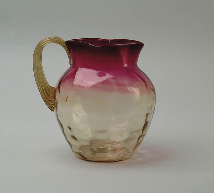 AMBERINA MILK PITCHER. I.T.P. design with square top, applied reeded handle. Ground pontil. SIZE: 6 1/4″ tall. CONDITION: Very good to excellent. 5-67088 (200-400)