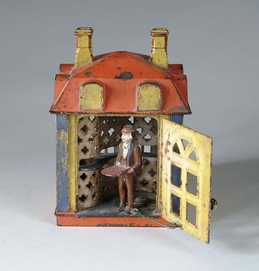 NOVELTY MECHANICAL BANK. Building bank from J & E Stevens. Open door to reveal teller with coin tray. He disappears upon closing door, depositing coin. SIZE: 4-1/2″ w x 4-1/2″ d x 6-1/2″ h. CONDITION: Very good, retaining much of original paint. AT 5-71667-1 (400-600)