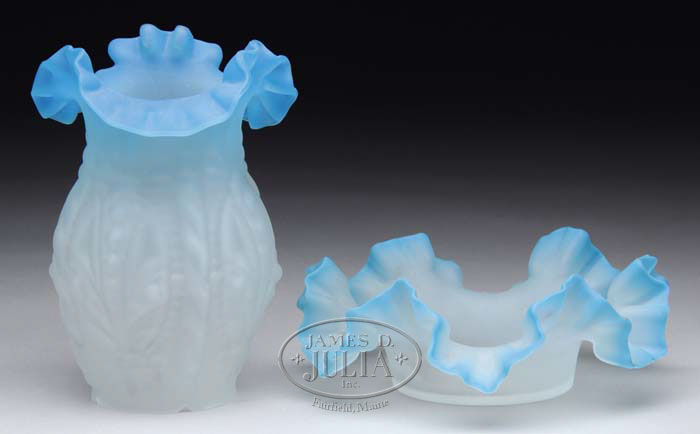 FROSTED GLASS FAIRY LAMP R-248. Bulbous embossed frosted dome with fluted and deeply ruffled blue top rim. Dome rests in a matching low base. SIZE: 6-1/2″ t. CONDITION: Very good to excellent. 5-65486 (200-400)