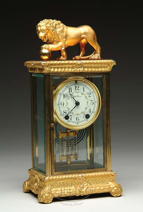 FINE SETH THOMAS GLASS AND BRASS CRYSTAL REGULATOR CLOCK. Fine glass and brass cased surmounted by a standing lion. Key and pendulum present. Beveled glass on four sides with a decorative base. Dial decorated with flower swags and signed “Seth Thomas”. PROVENANCE: From an eastern Connecticut Estate. SIZE: 15-1/2” h x 7-3/4” w x 6” d. CONDITION: Very good. 9-29864 (400-600)
