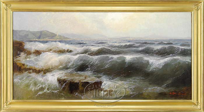 ALEXANDER DZIGURSKI (American, 1911-1995) LIGHTHOUSE ON THE COAST. Large oil on canvas panoramic coastal scene shows green and white tipped waves crashing onto rock ledges. The background shows a large coastline with left hand hills holding a large white lighthouse. Mountains are seen in the background with what appears to be large towns along its edge. Signed lower right. Housed in a modern gilt molded wood frame. Possibly a California coastline scene. SIZE: 23-3/4″ x 47-1/2″. CONDITION: Wax relining, some minor touch up, very good. 9-91615 (3,000-5,000)