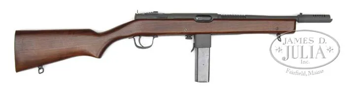 **H&R REISING M50 SUB-MACHINE GUN (C&R). SN 90745. .45ACP. Parkerized finish with wooden stock, finned bbl (14 fins) with compensator, elevation adjustable rear peep sight, drift adjustable front blade sight, high capacity mag-well, includes one 20-round magazine. CONDITION: Finish is thick, complete, and uniform on all metal surfaces. Very little rack wear is evident. Stock is in beautiful condition, also showing very little marking from use or handling. Closed bolt select fire mechanism operates smoothly and properly when cycled by hand. Sling swivel on bottom of stock at both front and rear. Bbl is dirty, but rifling is well pronounced. 4-44970 JZ22 (3,000-5,000)