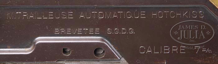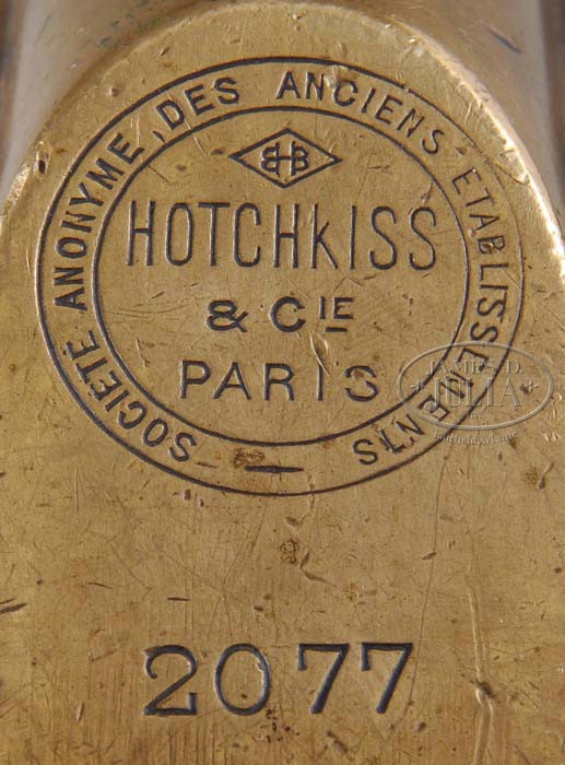 ***HOTCHKISS MODEL 1897 (PRE-86 DEALER SAMPLE). SN 2077. Cal. 7mm. 31″ bbl. Accessories includes orig Hotchkiss tripod with SN 2083 =, on brass plate, , orig leather gunners pouch w/tools, 1 spare firing pin, armorer’s box w/large wrench and cleaning rods, leather-covered brass spare bbl carrier w/spare bbl, orig metal reinforced wooden feed strip box w/10 brass feed strips, also approx 700 rnds modern ammo. Neither bbl matches gun SN nor does brass feed shuttle. Tripod traverses and elevates smoothly. Rear retaining pin to mount gun on tripod elevation screw is missing. Firing mechanism moves smoothly when cycled by hand. This arm appears fully functional. CONDITION: Blued finish and overall appearance excellent. Both bbls retain 90% or better of bright blue finish with majority of loss on outer edge of cooling rings. Receiver bluing is 90% turning a brown patina. Brass shoulder extension and feed shuttle very attractive. Tripod has lost majority of green paint on legs but retains most of green paint on head. Bore of spare bbl is grimy and dark. Bore of bbl on gun is uncleaned but lans have shiny spots and it may clean up. Wooden feed strip box retains orig green paint. Carrying strap on box is broken but present. Leather is soft and cracking. Spare bbl carrier exterior leather has some dings,gouges and separated stitching, but overall is in decent condition for its age. Extremely attractive looking set-up on tripod. Sure to please and with accessories and spare bbl would make an excellent addition to any WWI firearms collection. 4-37883 JWK37 (8,000-12,000)